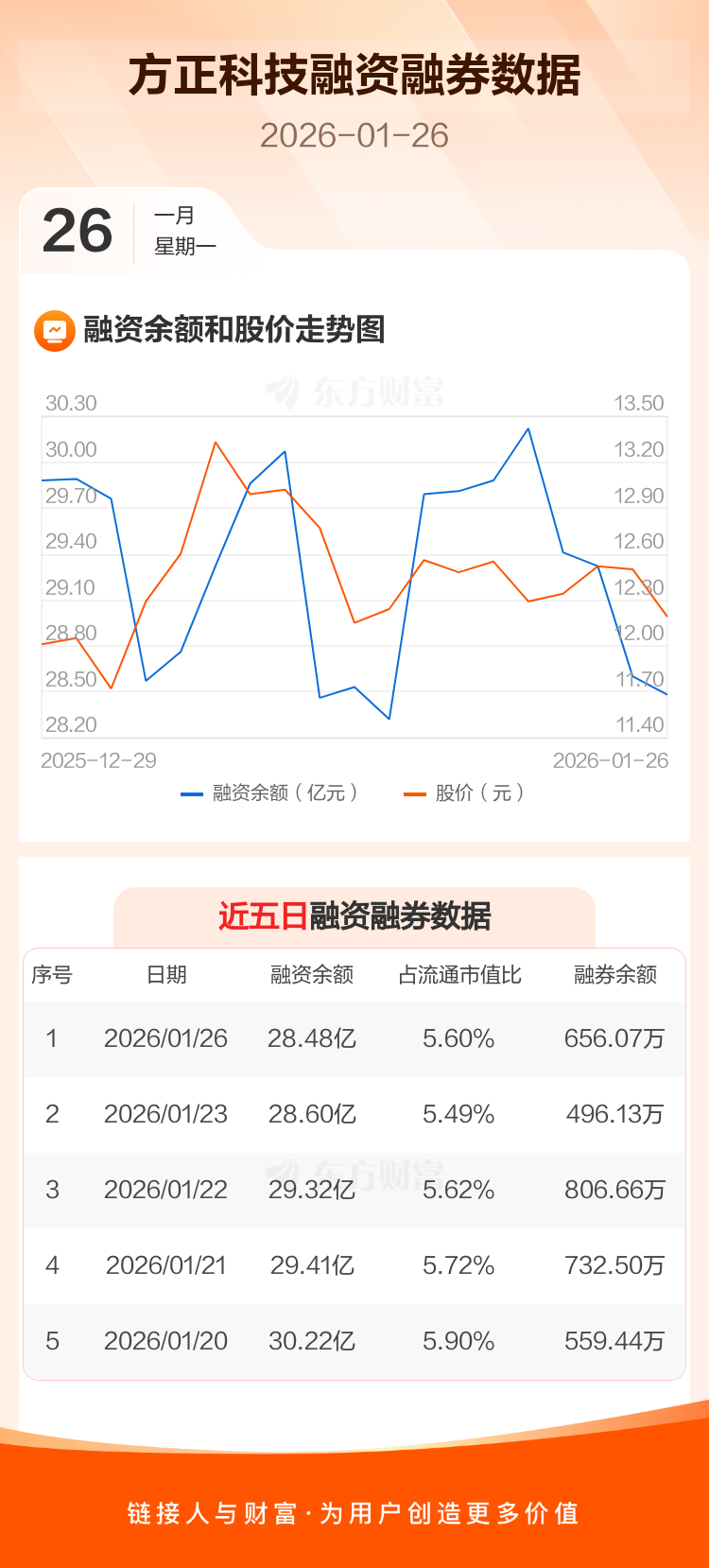 交易所最新数据显示,方正科技于2026年1月26日获融资买入1.30亿元,融资偿还1.42亿元,当日融资净偿还1214.51万元。目前,该股融资余额28.48亿,占流通市值比例为5.60%。