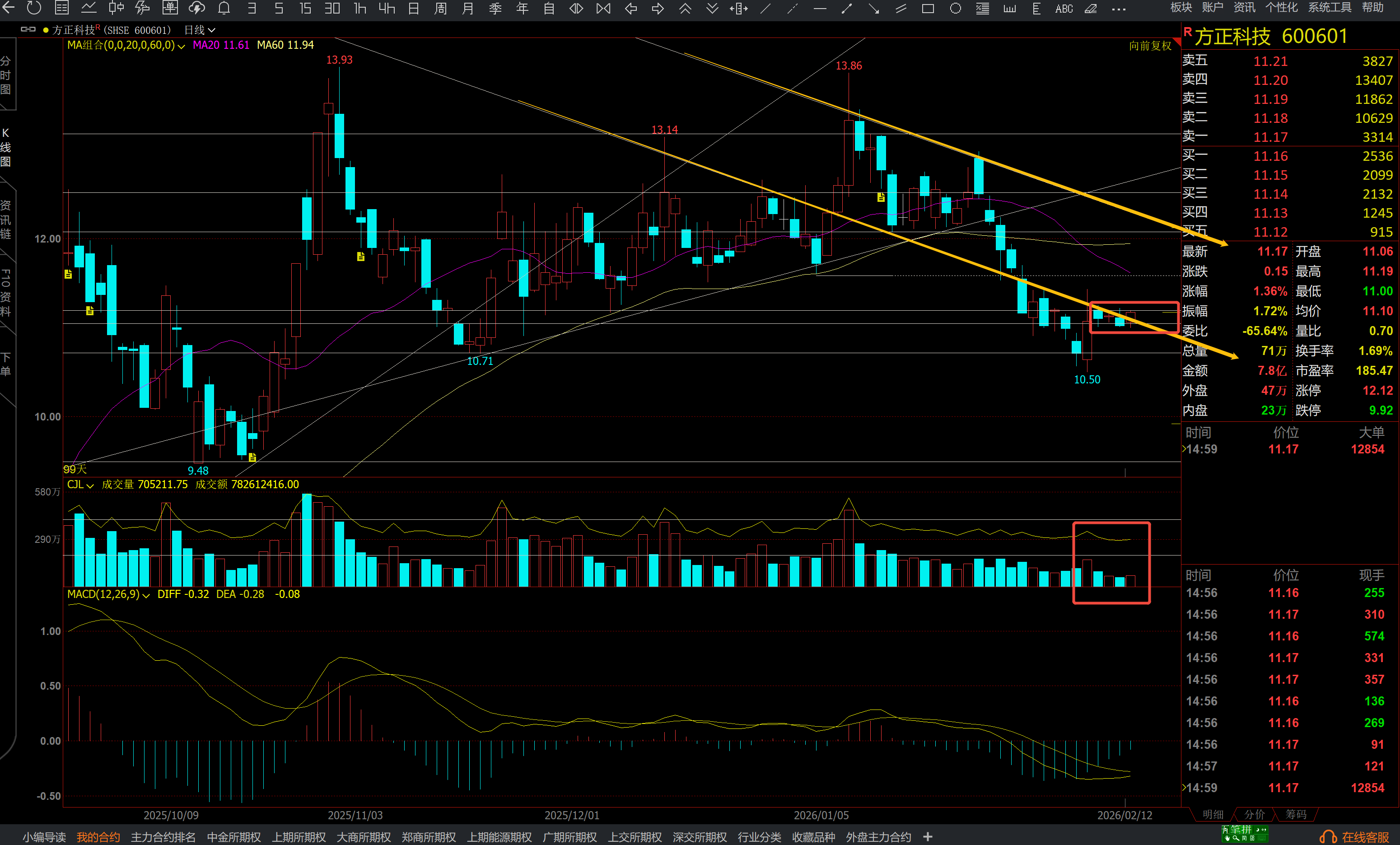 方正科技2月12日分析——震荡吸筹。方正科技今天收小阳线,成交量放大,没有创昨日新高,但今天突破了趋势线下沿,重回趋势线内。2月6日收阳线后,本周一直围绕11块小阴小阳,可以理解这是吸筹行为。方正科技纳入MSCI中国指数了,2月27日生效,接下来,会有被动资金进入,可能会有尾盘拉升现象,整体会继续震荡格局。年内就剩最后一个交易日了,没有什么空间了,看年后了。压的越紧,反弹的越高。