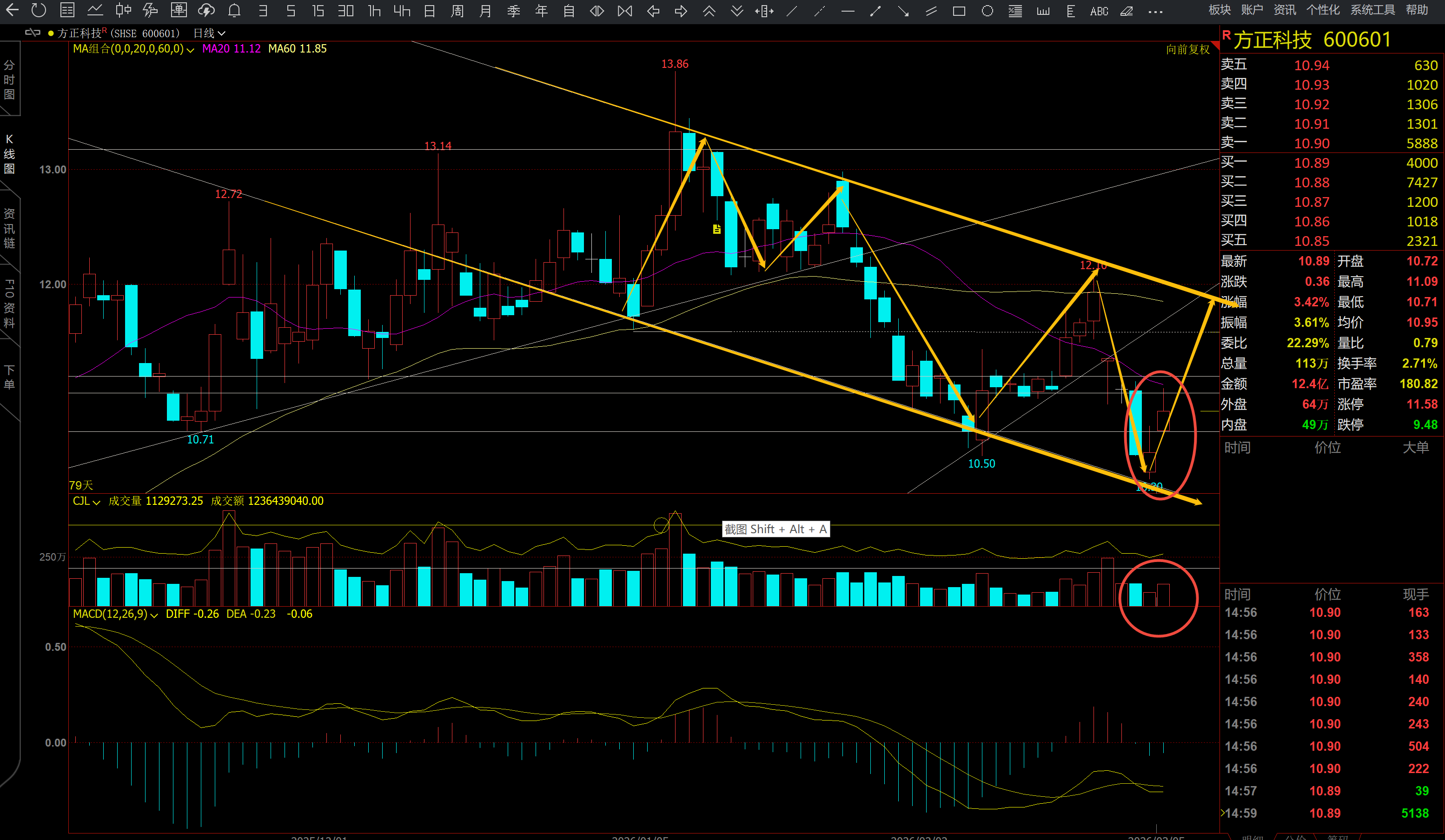 方正科技3月5日分析——反弹持续,有一定抛压。今天方正创昨天新高,收带上影线的中阳线,成交量放大,反弹的质量不算太高,连续两天反弹K线收上影线,显示还是有一定的抛压,但好呆是今天量能没有放太大。如果明天再洗盘,希望看到的是小阴+极小成交量的组合K线,这样的话,反弹到11.8是没有问题的,否则继续考验10.30的位置。