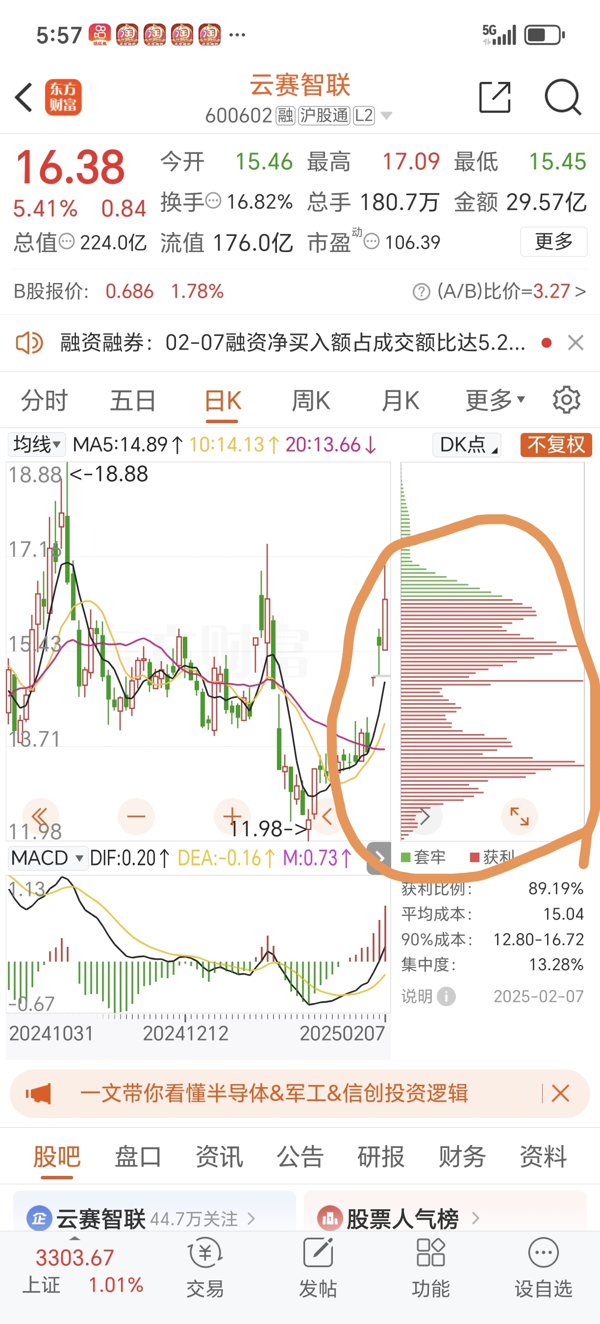 $云赛智联(SH600602)$ 看下图画圈的地方,获利资金都没走,说明大家一致看多,上方压力小,金叉已形成,资金分歧转一致