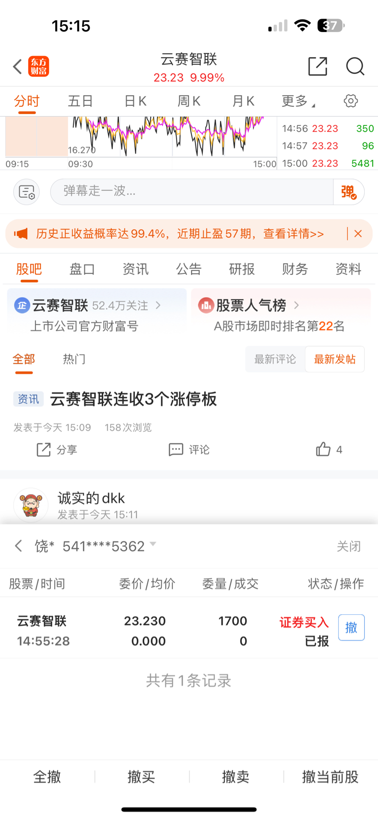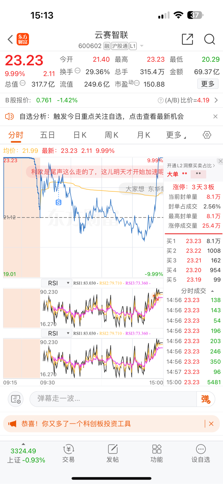 $云赛智联(SH600602)$ 真不能犹豫,下午一直在纠结水下买不买还是没敢动,尾盘眼睁睁的看他涨停,涨停单还没进去