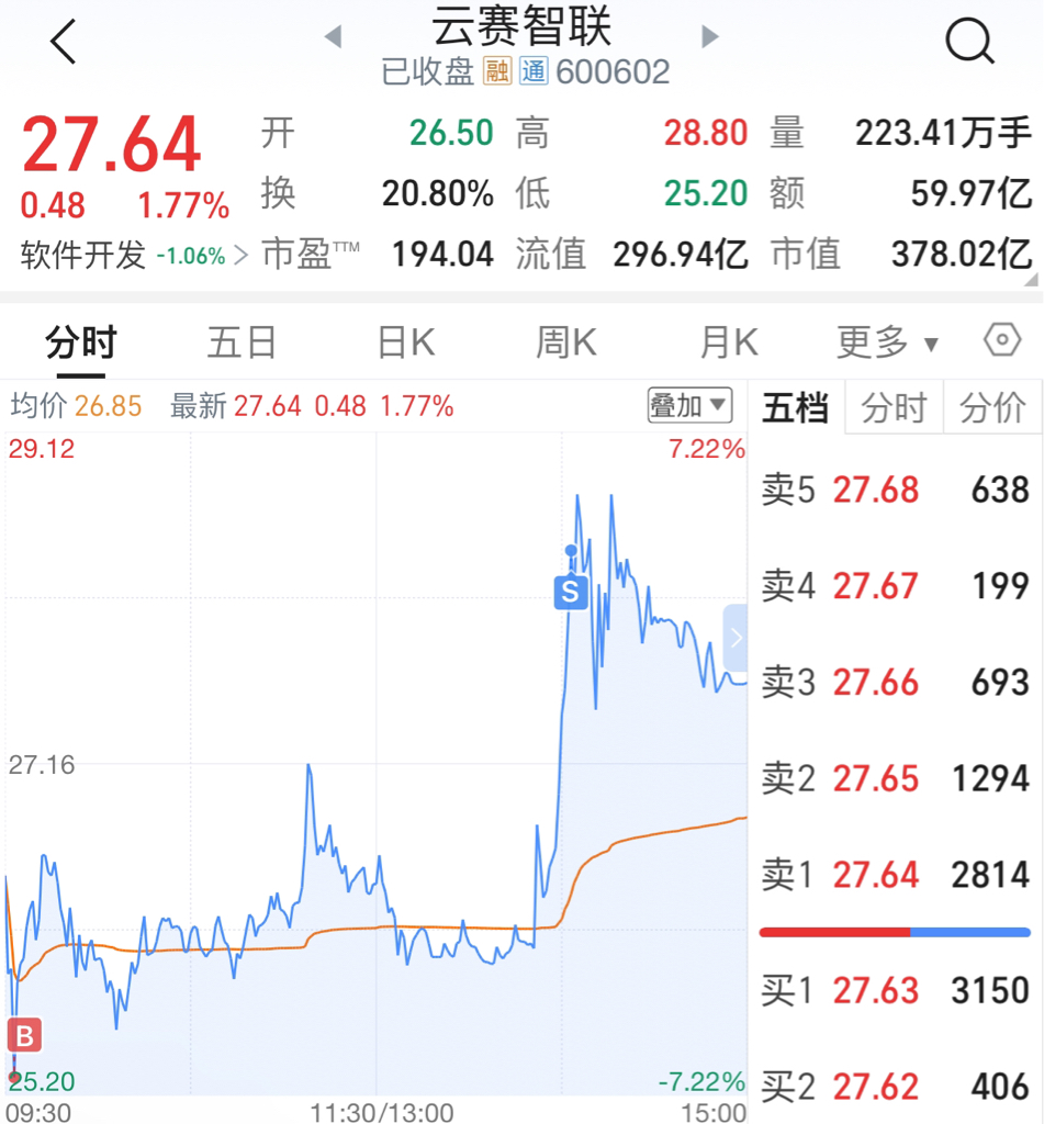 $云赛智联(SH600602)$ 又是一次漂亮操作