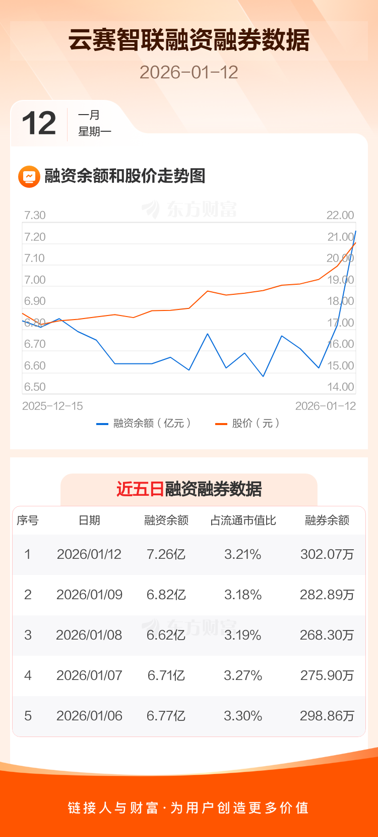 交易所最新数据显示,云赛智联于2026年1月12日获融资买入1.39亿元,融资偿还9507.78万元,当日融资净买入4397.89万元。目前,该股融资余额7.26亿,占流通市值比例为3.21%。