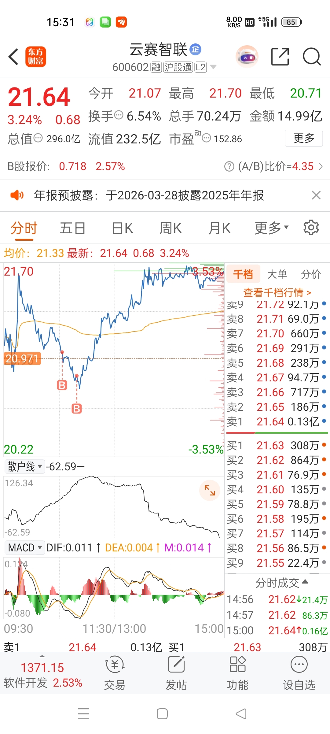$云赛智联(SH600602)$ 明天23.80卖,洗盘完成,继续突破。