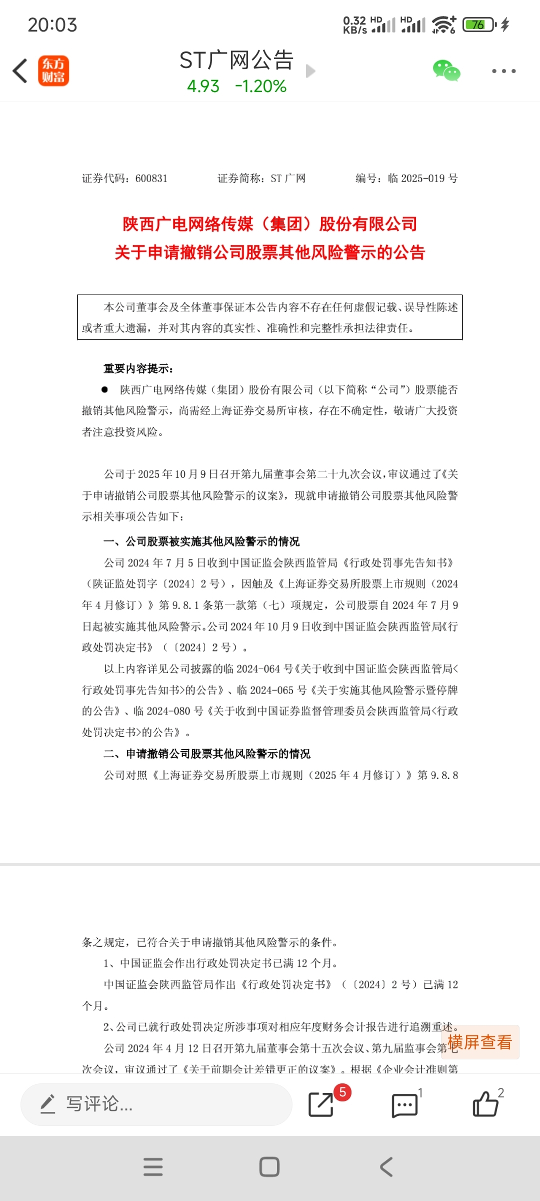 广网晚上八点出申请摘帽公告。期待广物12号也会出申请摘帽公告!