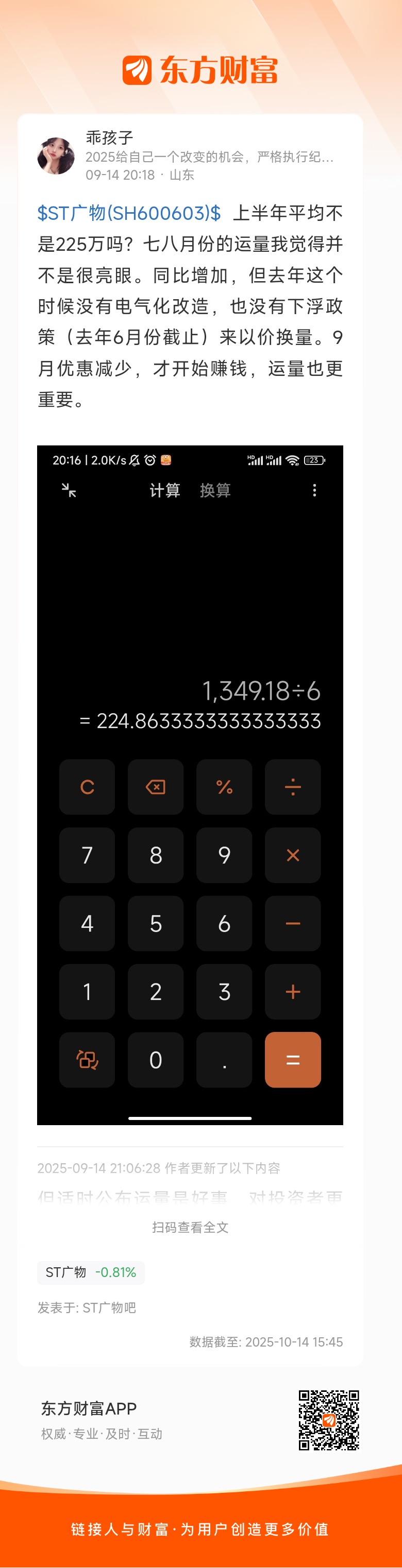 $ST广物(SH600603)$ 上半年平均不是225万吗?七八月份的运量我觉得并不是很亮眼。同比增加,但去年这个时候没有电气化改造,也没有下浮政策(去年6月份截止)来以价换量。9月优惠减少,才开始赚钱,运量也更重要。