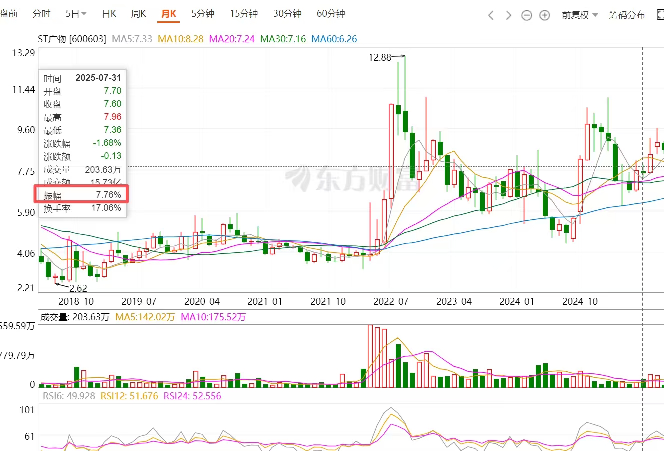 $ST广物(SH600603)$ 这股很神奇,能做到一个月振幅7.76%,大多数个股一天都能到这个振幅。