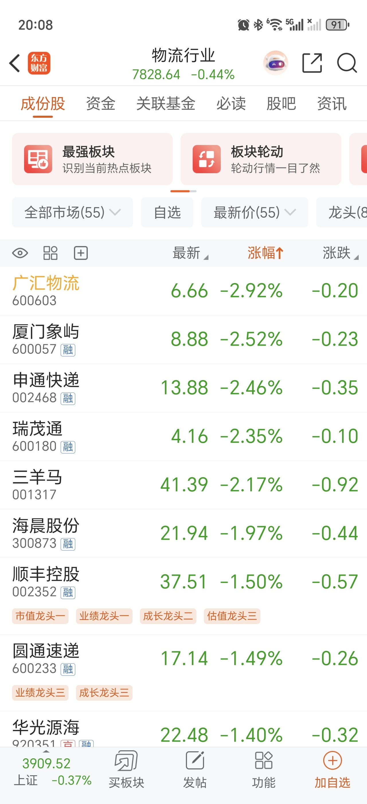 $广汇物流(SH600603)$ 跌幅板块第一,666