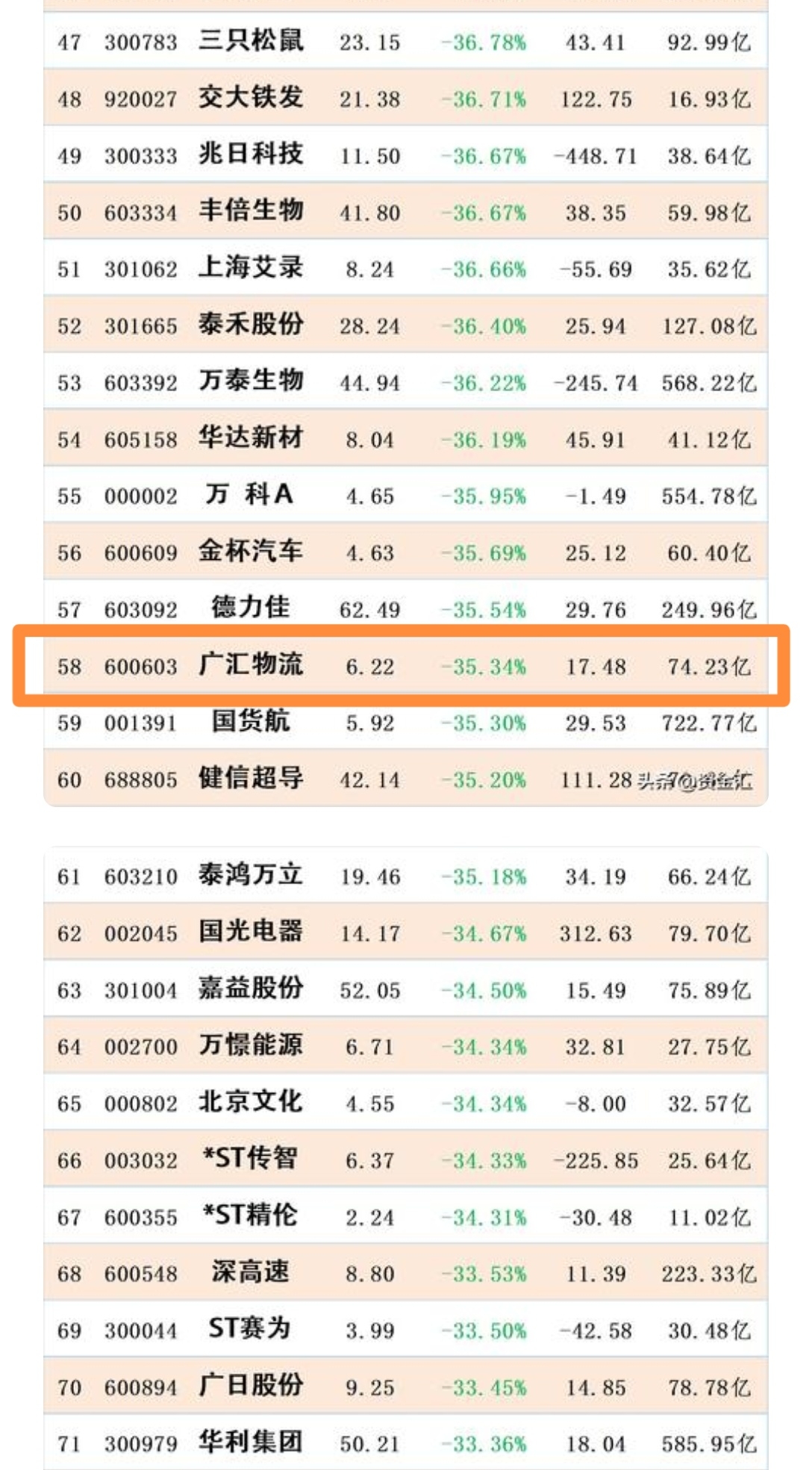 广汇物流荣登2025年A股年度跌幅榜第58位。