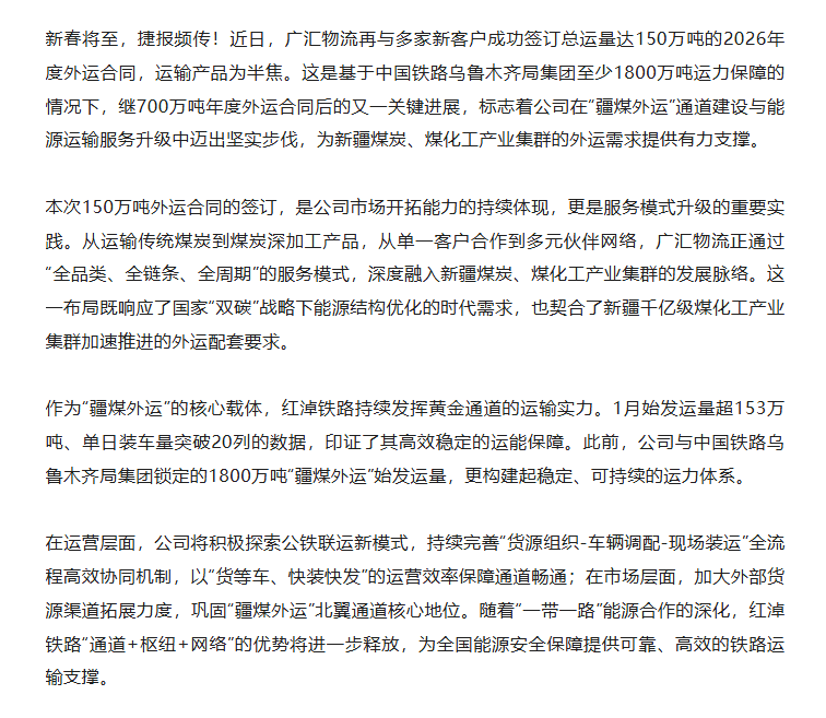 广汇物流疆煤外运再扩圈150万吨新单落地