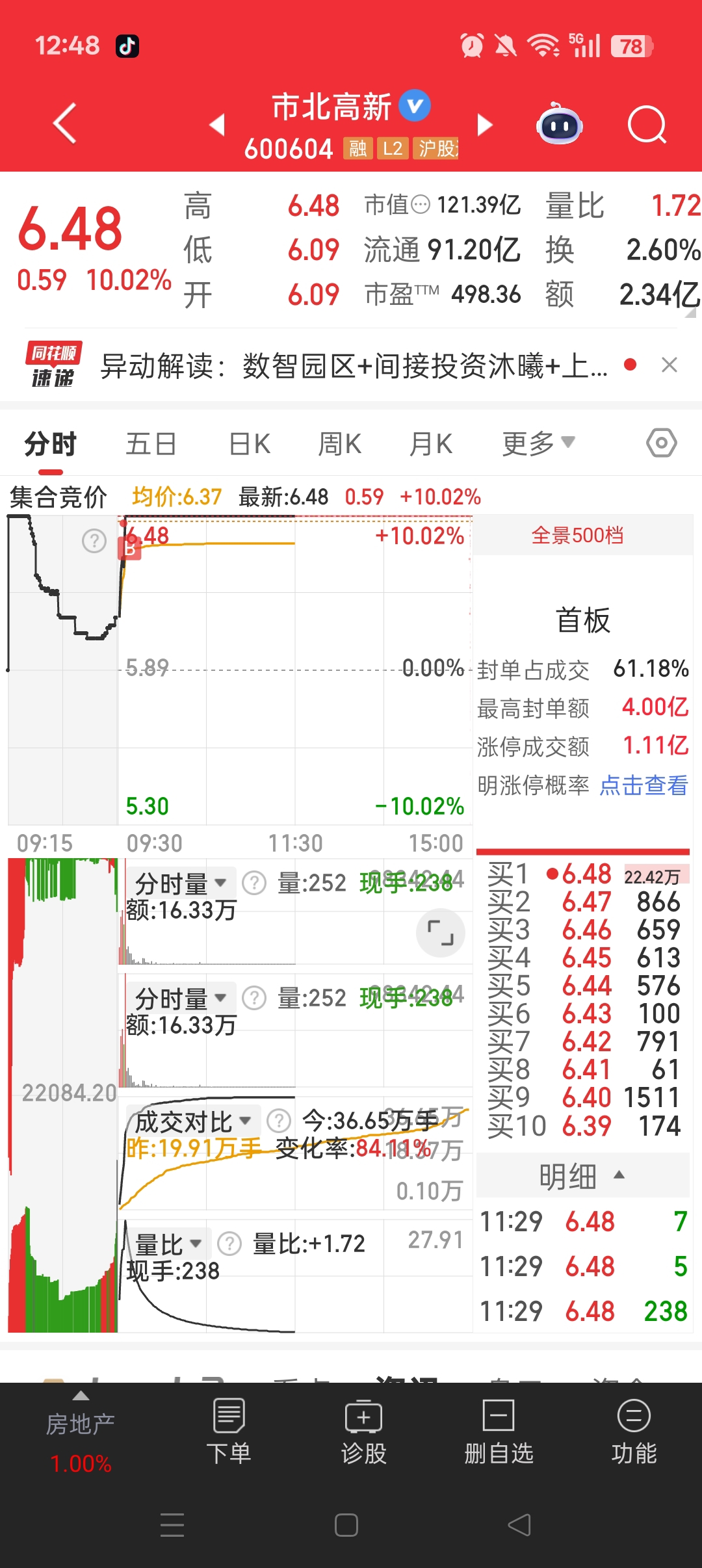 $市北高新(SH600604)$ 周末提示,今天高开秒板!