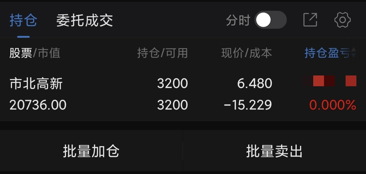 $市北高新(SH600604)$ 市北高新,我挺感激这只股票的,当年中车合并的站岗亏损至今都没有弥补,都靠市北做波段,我已经拿了市北十年了,三年前再建仓,成本做到5块在7月中出掉了99%仓位,空仓后5.55左右持续建仓,虽然跑输了其他个股,但就是熟悉的感觉,目前降低股票投资额度,持股3000股(满仓),成本-15,利润在里面奔跑,加油市北。#炒股日记# #投资随笔#