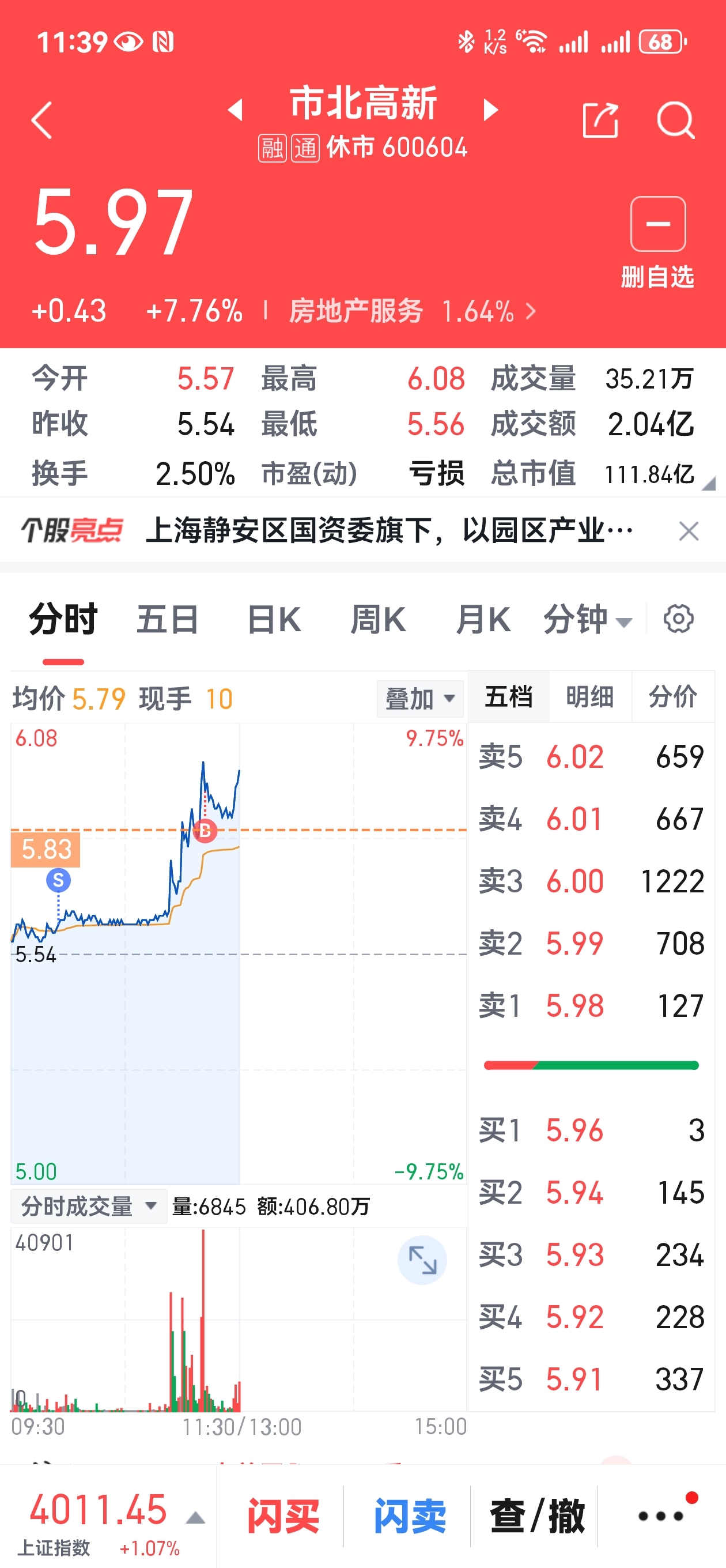 $市北高新(SH600604)$ 卖飞了,跟回来。