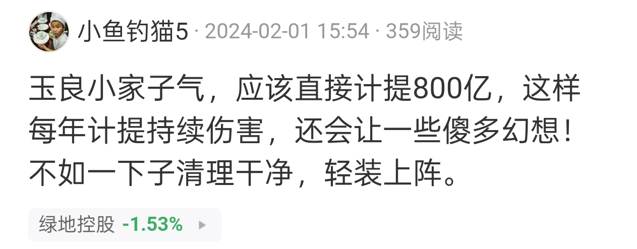 $绿地控股(SH600606)$ 又一年到了,今年真不好说,还是倾向于硬撑着不计提或少计提,避免st。前几年一直说玉良不够狠,房价下跌减值不可避免早计提多点就不会现在这么犹豫了。