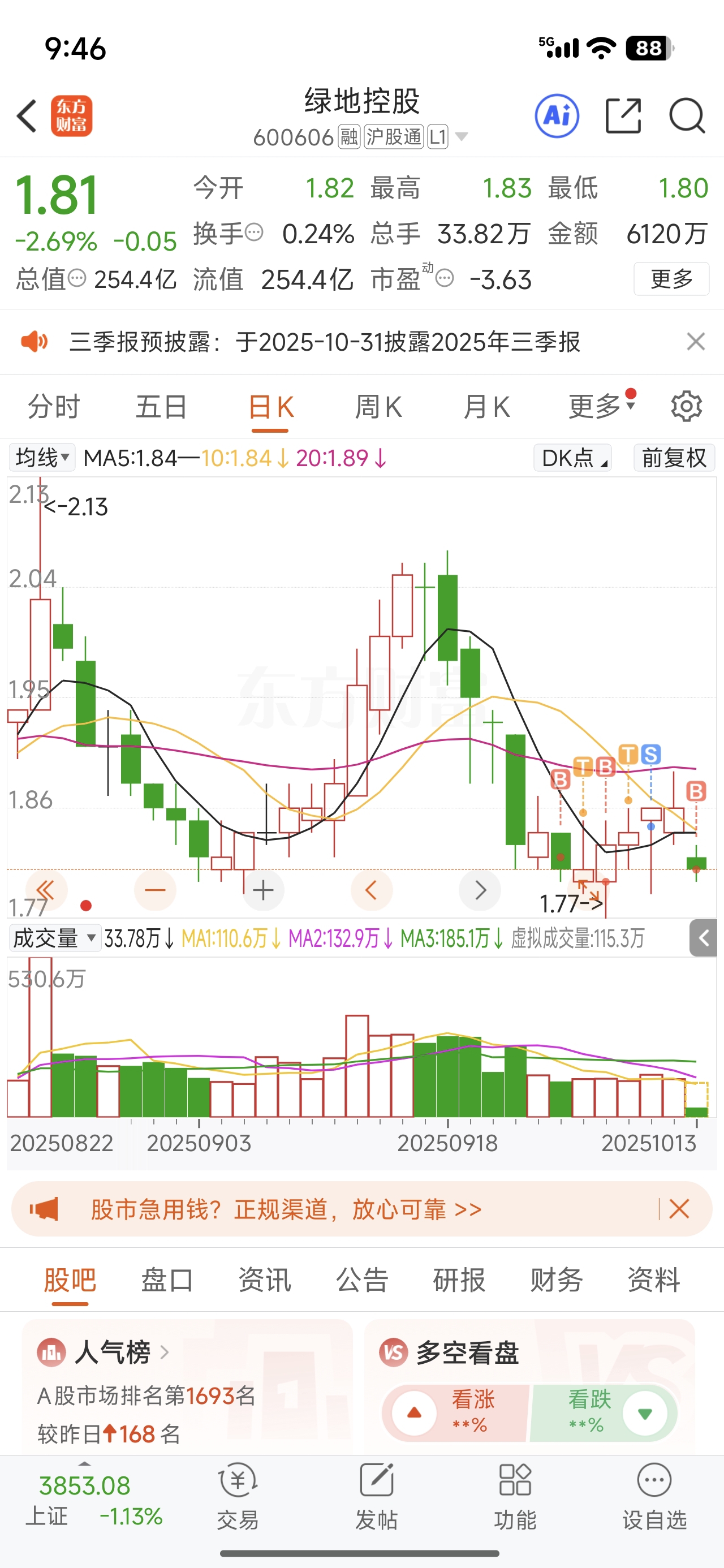 $绿地控股(SH600606)$ 股民赚钱难啊