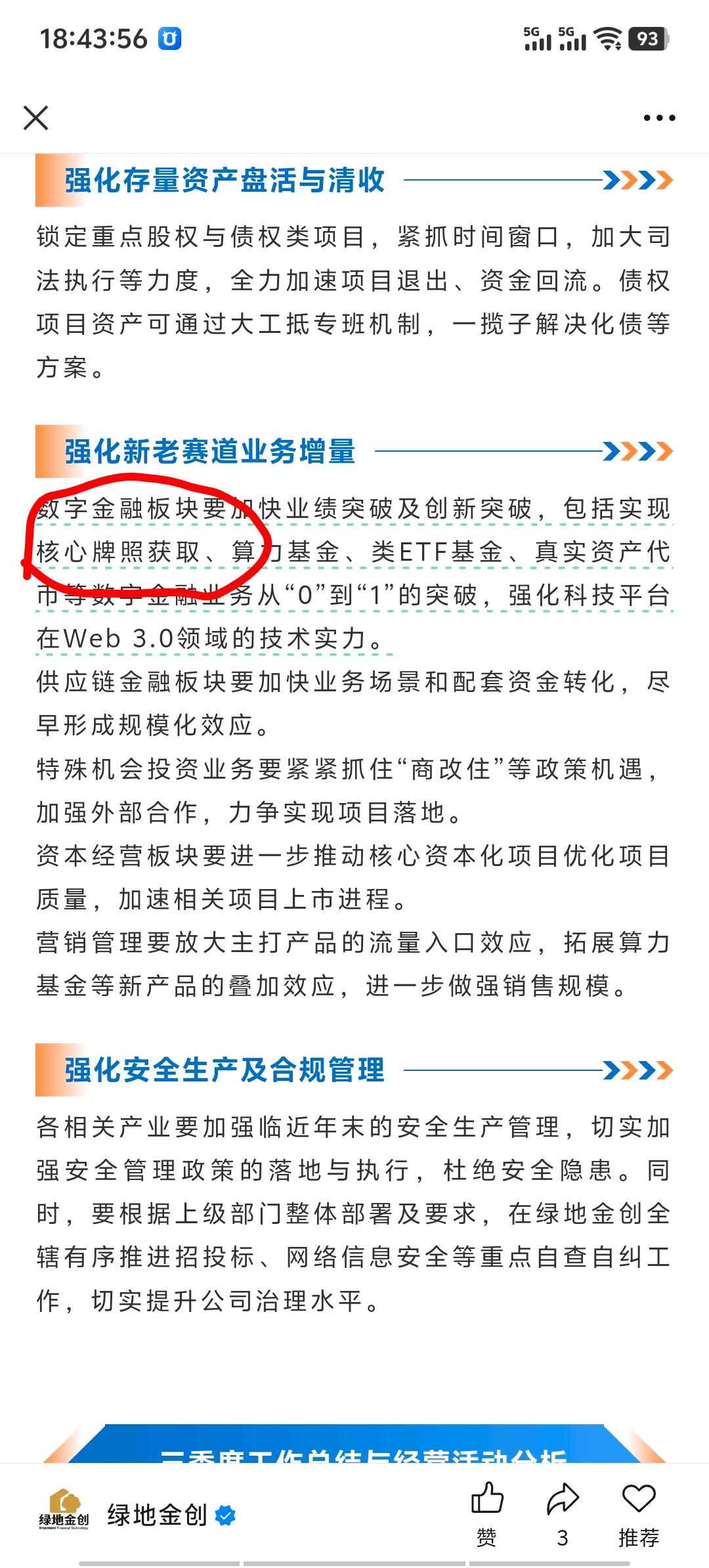 $绿地控股(SH600606)$ 10月17日,绿地金创召开季度工作会议,传达绿地集团季度工作会议精神,总结绿地金创三季度工作成绩,部署四季度重点工作,业务条线代表交流重点工作目标与措施。绿地金创各部室、单位的中层及以上干部参加会议。