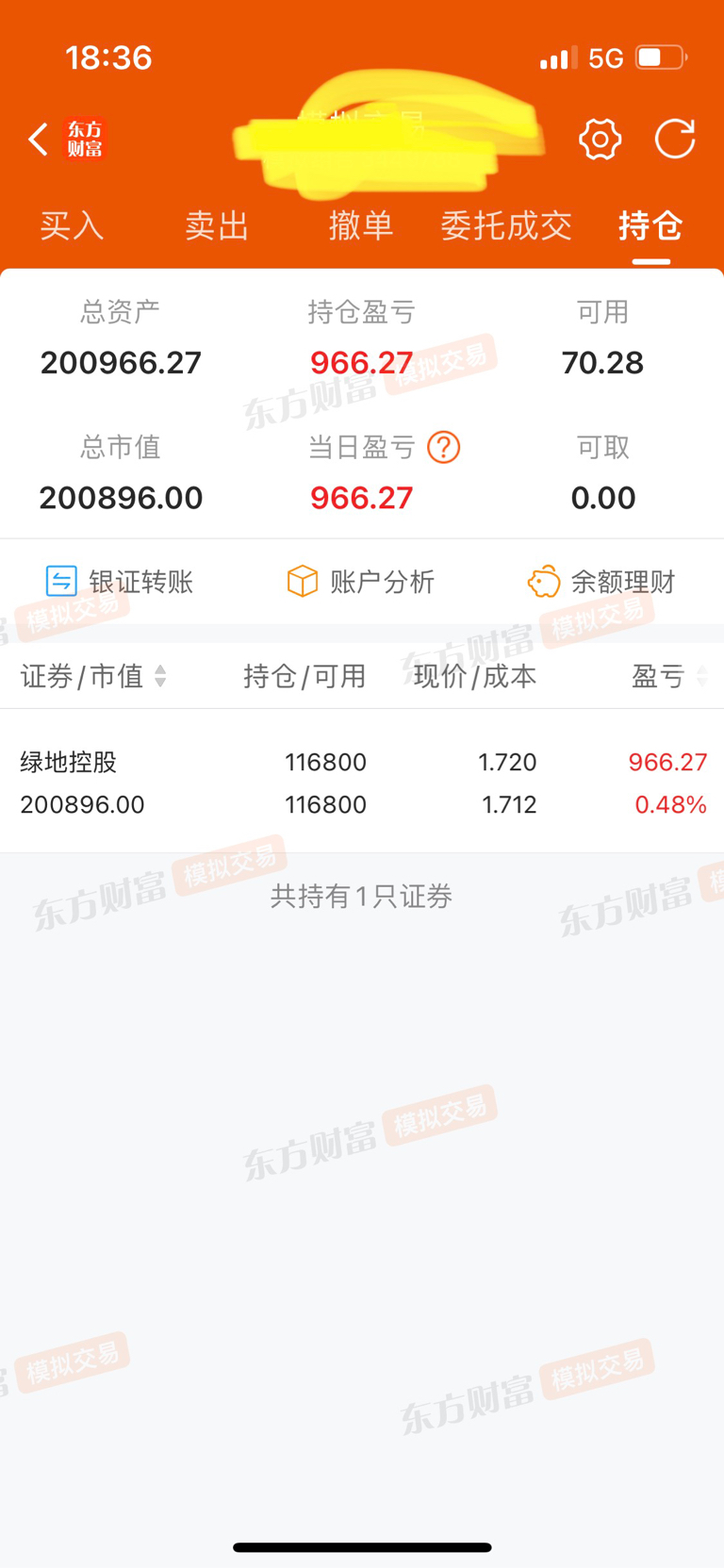 $绿地控股(SH600606)$ 挑战20万到1000万今天第一天