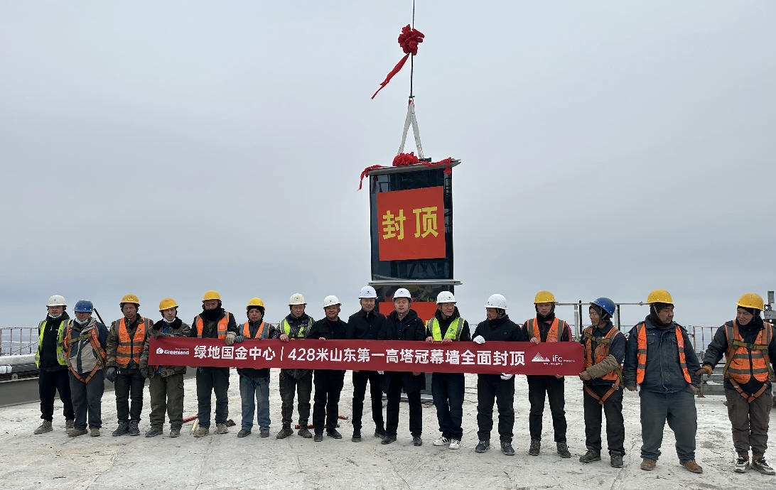12月12日上午,在济南中央商务区“群峰之巅”,随着最后一块幕墙单元体的顺利吊装