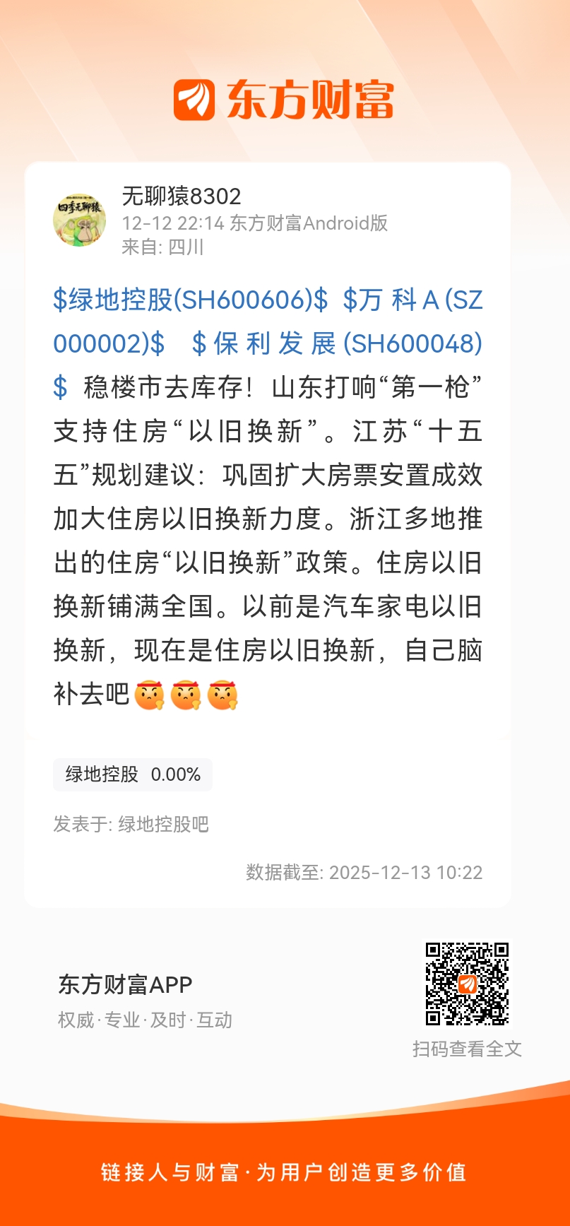 $绿地控股(SH600606)$ $万 科A(SZ000002)$ $保利发展(SH600048)$ 稳楼市去库存!山东打响“第一枪” 支持住房“以旧换新”。江苏“十五五”规划建议:巩固扩大房票安置成效 加大住房以旧换新力度。浙江多地推出的住房“以旧换新”政策。住房以旧换新铺满全国。以前是汽车家电以旧换新,现在是住房以旧换新,自己脑补去吧