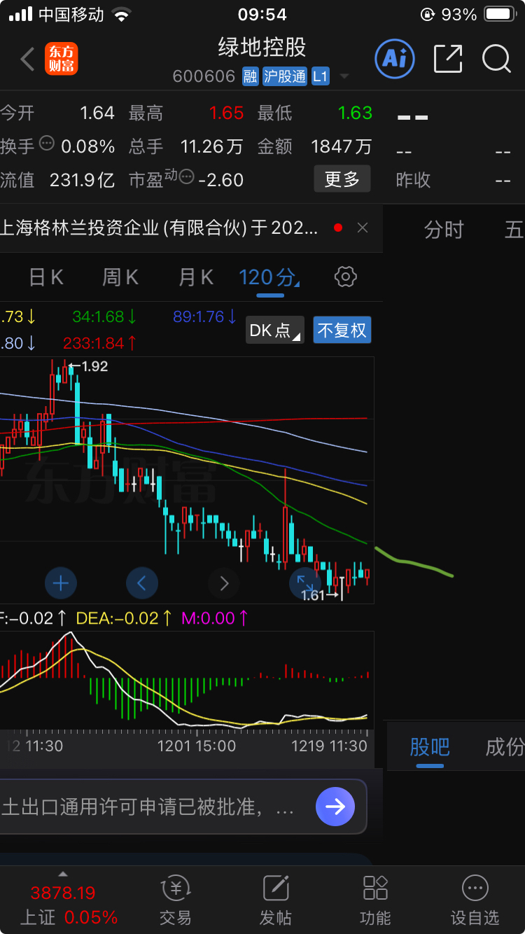 $绿地控股(SH600606)$ 按目前120分钟级别均线态势判断——在股价接触到下斜的绿色均线之前的这两、三个交易日内应该没什么大变化。之后看涨(即从低点右侧的缓坡助跑转拉升段)