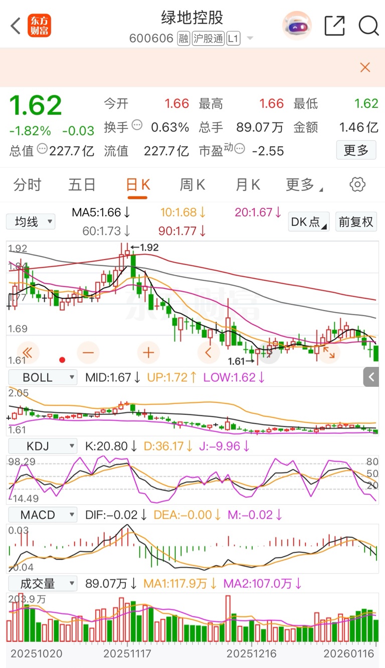 绿地,我也跟了几个月,同时从绿地也实践出了不少经验。大趋势来看是下跌,近期放缓,主力在构筑阶段性底部。为什么主力要在这时构筑呢,因为绿地在转型。远的不说了,咱们说一下短线,这是日线图。KDJ超卖为负9.96,意思是空方卖的差不多了,这个位置哪怕跌也跌不到哪里去,有资金的朋友可以分批买入了,记住分批,我看了一下几支高位连续跌停的股票,kdj为负21,超超卖,所以负9.96是可以买入,但可能还要跌,设定跌几个点就买一批,分批次进行。否极泰来,跌到一定程度了就会反弹,这时就要把自己分批买入的股票又分批卖出。这个卖点怎么看呢,这时可以看一下boll(布林)指标。上中下轨,中轨为上涨下跌分割线,下轨为下跌的支撑位,中轨为下跌转上涨的压力位,同时中轨的数值和20日线数值一致。下跌的股票反弹碰到中轨位置会再下跌,因为这里是压力,反复几次探中轨才会站稳中轨位置继续向上走。这时股票就开始转为上涨趋势,而上轨就是上涨的压力位。股价突破上轨线后继续上攻,上轨线就成了支撑位。绿地近期的卖点就是布林中轨和上轨。然后再说一下成交量,成交量有放大的迹象,说明交易比较活跃,不象前段时间那么小。我观察是主力进场加速。阶段性底差不多就是1.6。授之以鱼不如授之以渔,大家看了后就知道怎么操作,实战中问老师,回复晚了就会错过最佳买入卖出时机,