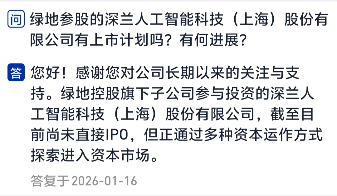 董秘改口了,重新回复了两条绿地控股的消息。深兰智能机器人科技有限公司没直接IPO