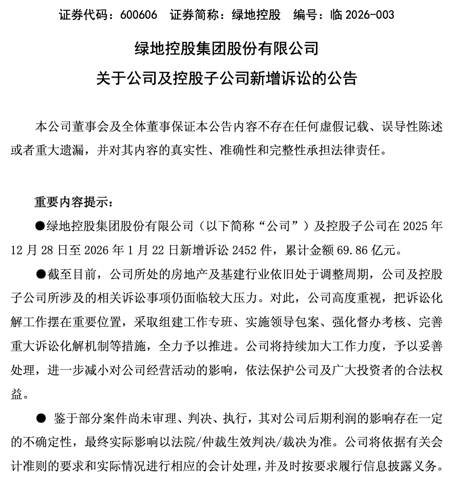 1月26日,绿地控股(600606)发布公告,公司及控股子公司在2025年12月28日至2026年1月22日新增诉讼2452件,累计金额69.86亿元。