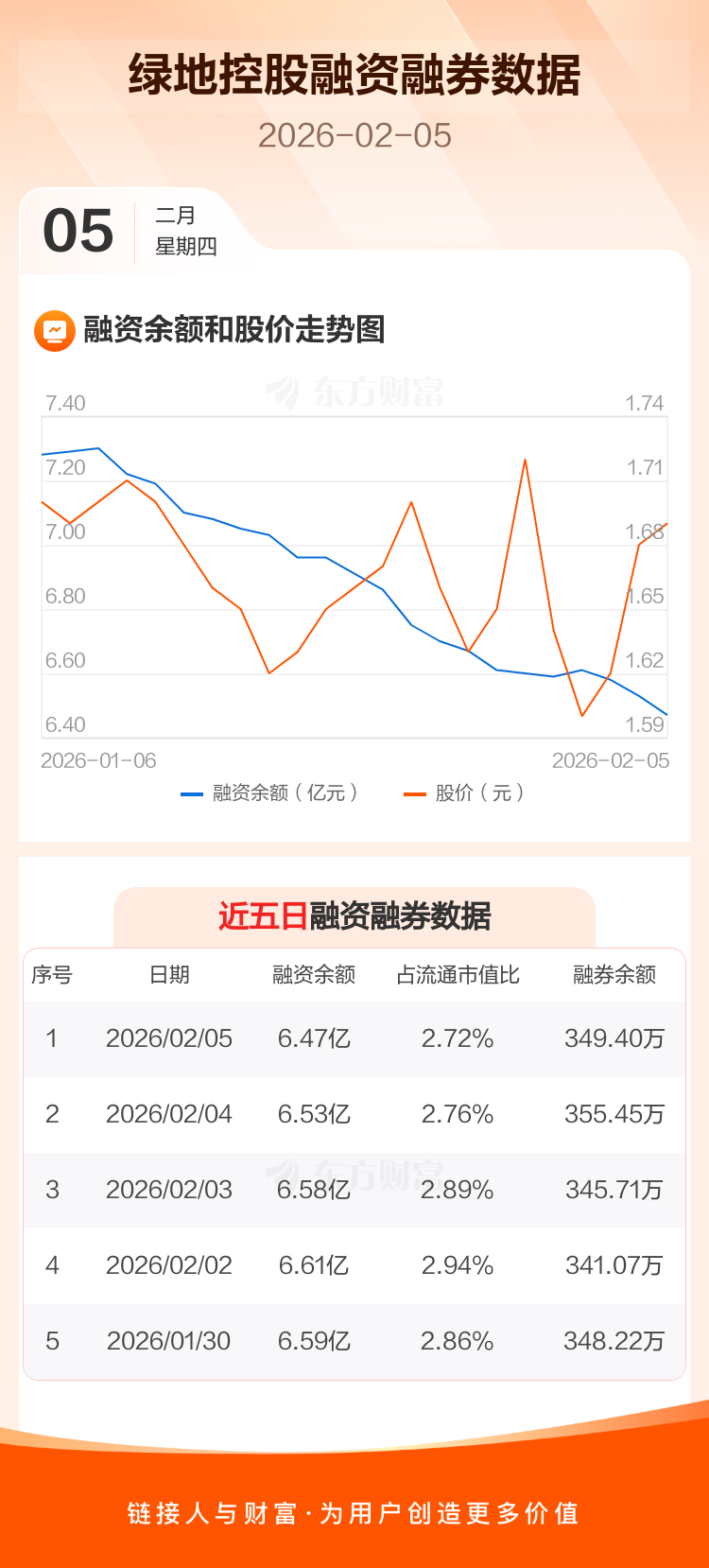 交易所最新数据显示,绿地控股于2026年2月5日获融资买入1361.11万元,融资偿还1915.55万元,当日融资净偿还554.45万元。目前,该股融资余额6.47亿,占流通市值比例为2.72%。