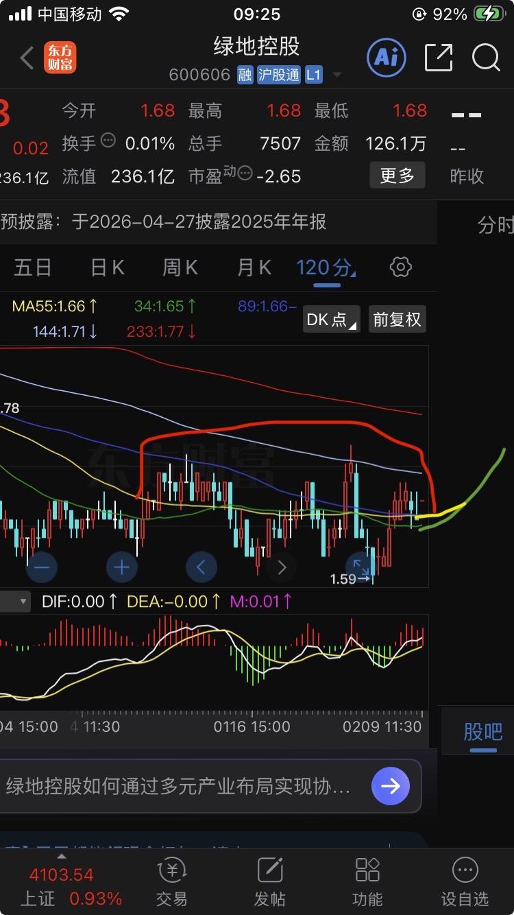 $绿地控股(SH600606)$ 按120分钟级别均线态势判断——磨底一个多月,终于是看到底部右侧拉升的出发位置了