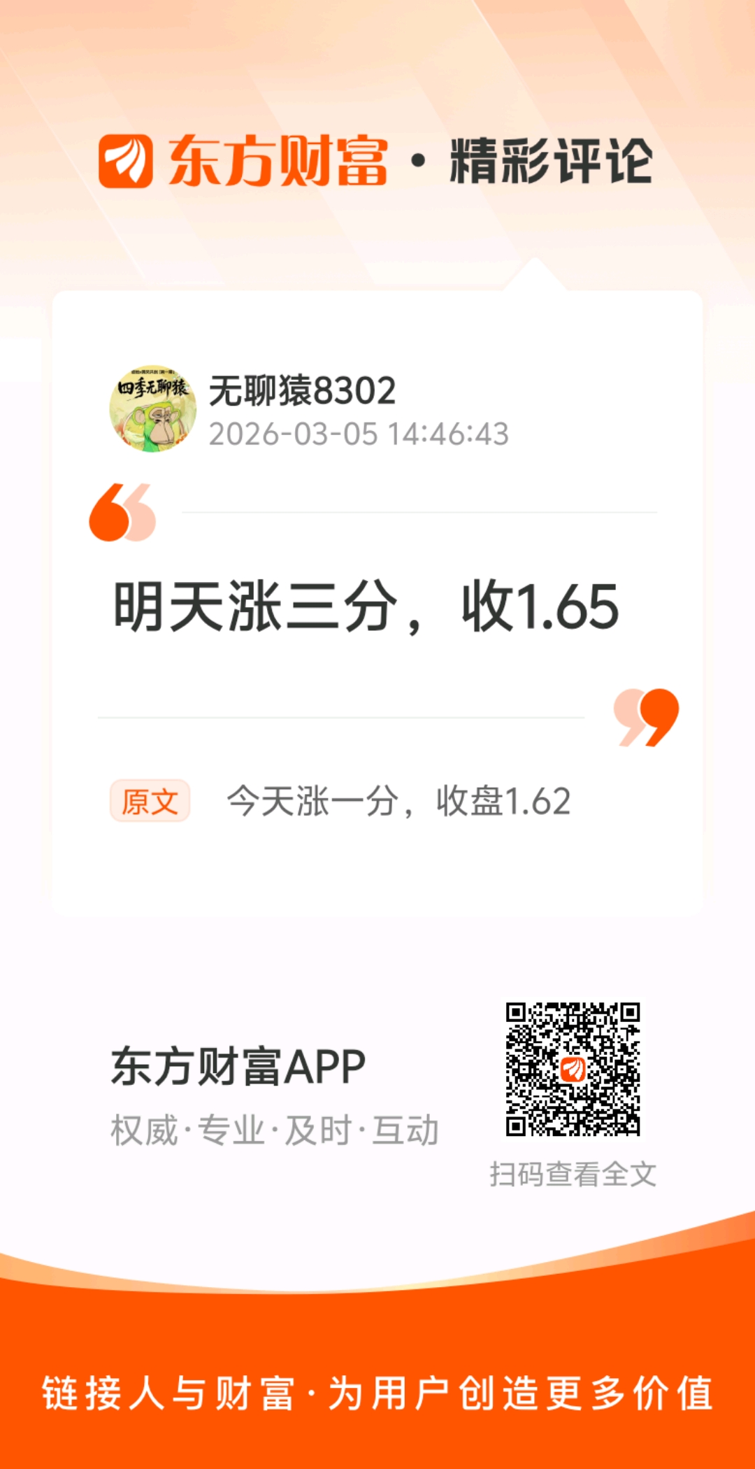 温馨提示: 1.根据《证券法》规定,禁止编造、传播虚假信息或者误导性信息,扰乱证券市场;2.用户在本社区发表的所有资料、言论等仅代表个人观点,与本网站立场无关,不对您构成任何投资建议。用户应基于自己的独立判断,自行决定证券投资并承担相应风险。《东方财富社区管理规定》