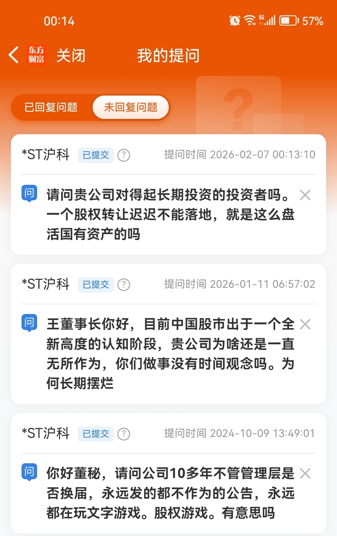 $*ST沪科(SH600608)$ 为啥我提的问题永远没人回答。