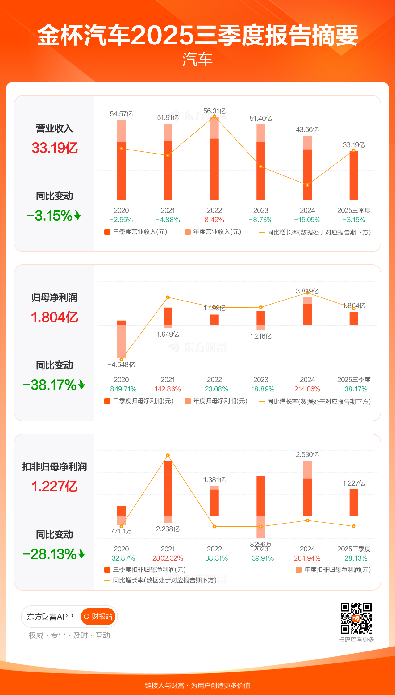 金杯汽车10月31日发布2025年三季报显示,公司前三季实现营业收入33.19亿元,同比下滑3.15%;归母净利润1.80亿元,同比下滑38.17%;扣非归母净利润1.23亿元,同比下滑28.13%。