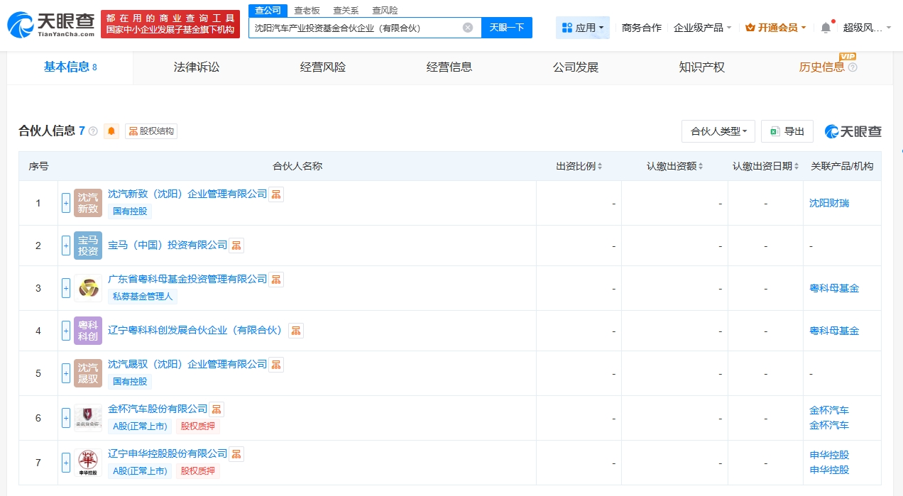 每经AI快讯,天眼查工商信息显示,近日,沈阳汽车产业投资基金合伙企业(有限合伙)成立,执行事务合伙人为沈汽新致(沈阳)企业管理有限公司、广东省粤科母基金投资管理有限公司,出资额8亿元人民币,经营范围包括创业投资、以私募基金从事股权投资、投资管理、资产管理等活动。合伙人信息显示,该基金由宝马(中国)投资有限公司、金杯汽车(600609)、申华控股(600653)等共同出资。