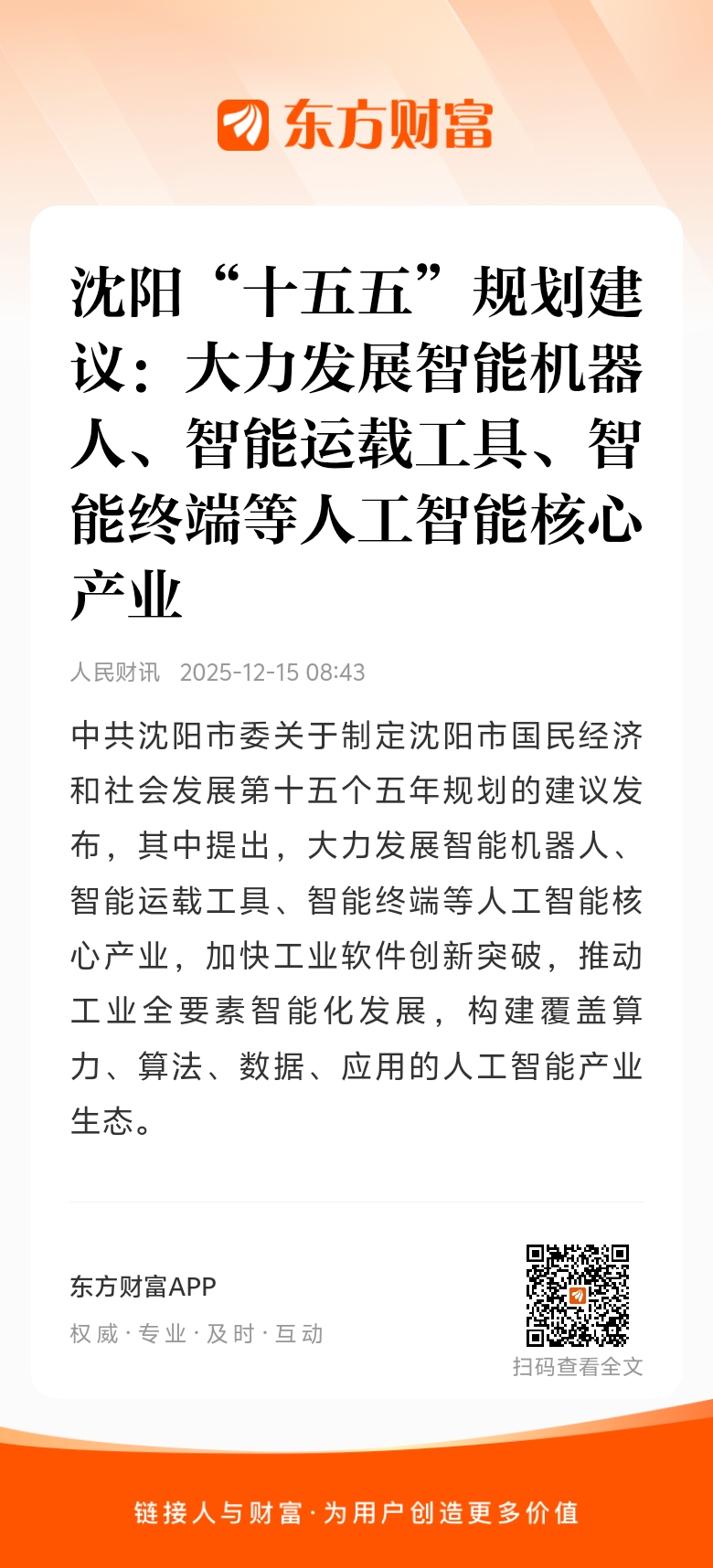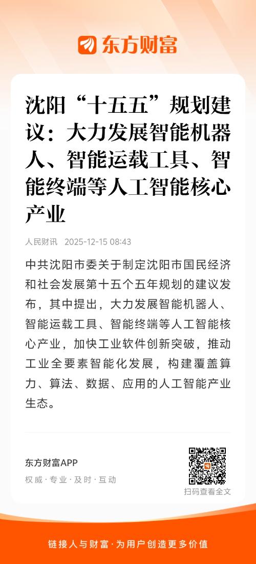 中共沈阳市委关于制定沈阳市国民经济和社会发展第十五个五年规划的建议发布,其中提出,大力发展智能机器人、智能运载工具、智能终端等人工智能核心产业,加快工业软件创新突破,推动工业全要素智能化发展,构建覆盖算力、算法、数据、应用的人工智能产业生态。深化与国内先进人工智能研究院所对接合作,支持智能硬件产品研发推广。深入实施“人工智能+”行动,加强人工智能同产业发展、文化建设、民生保障、社会治理相结合,培育一批融合行业高质量数据集的人工智能大模型,促进人工智能全方位赋能千行百业,加快形成智能经济和智能社会新形态。推动平台经济创新和健康发展。