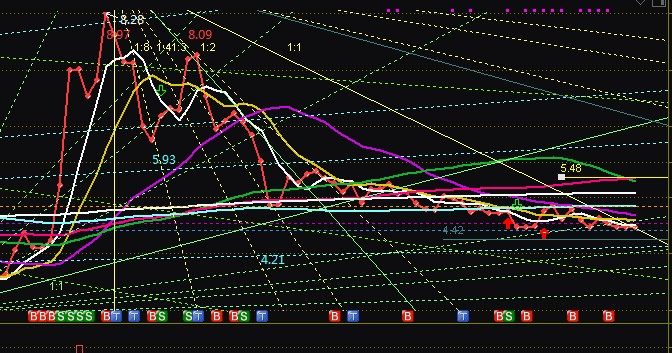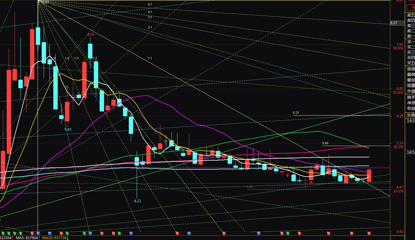 本周金杯周K线突破角度线1:1线,未来一周应该往5元方向靠近.