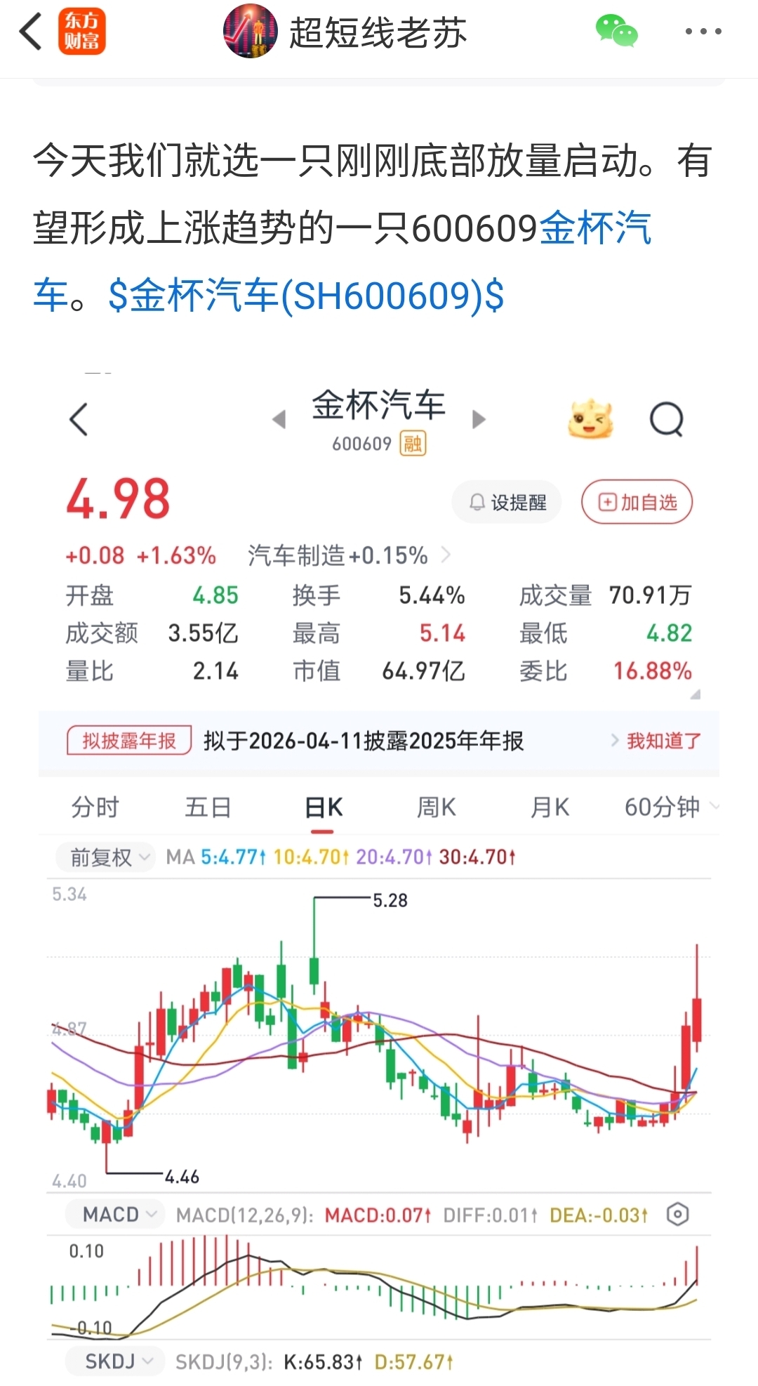 老苏的$金杯汽车(SH600609)$ 经过星期五的小小调整。今天也开始向上突破大涨了5点多。完全是按照我们的预料和计划在进行。