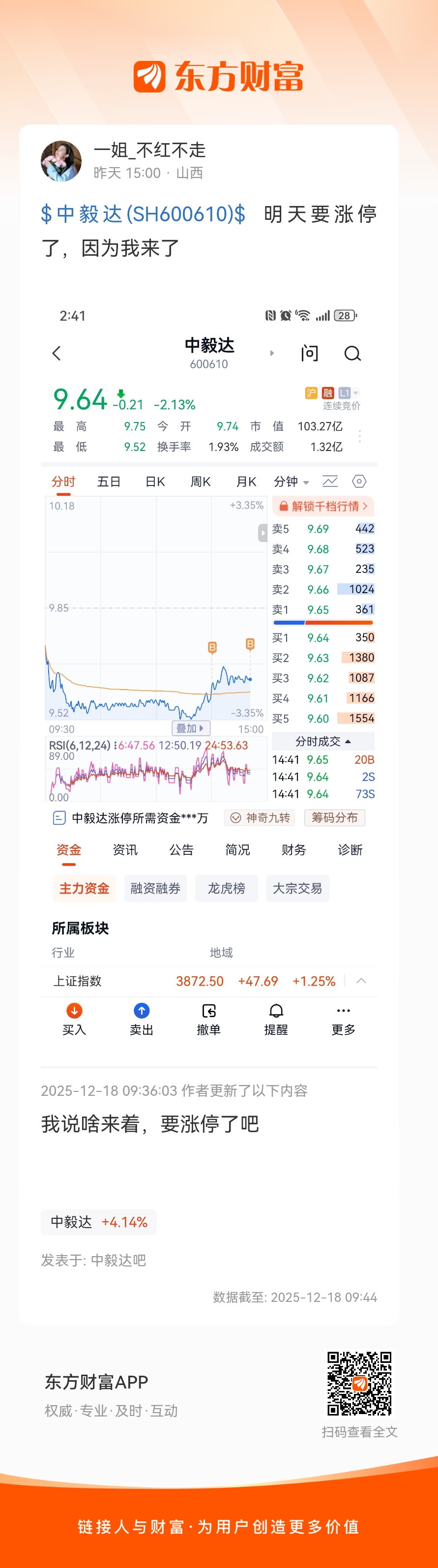 $中毅达(SH600610)$  明天要涨停了,因为我来了