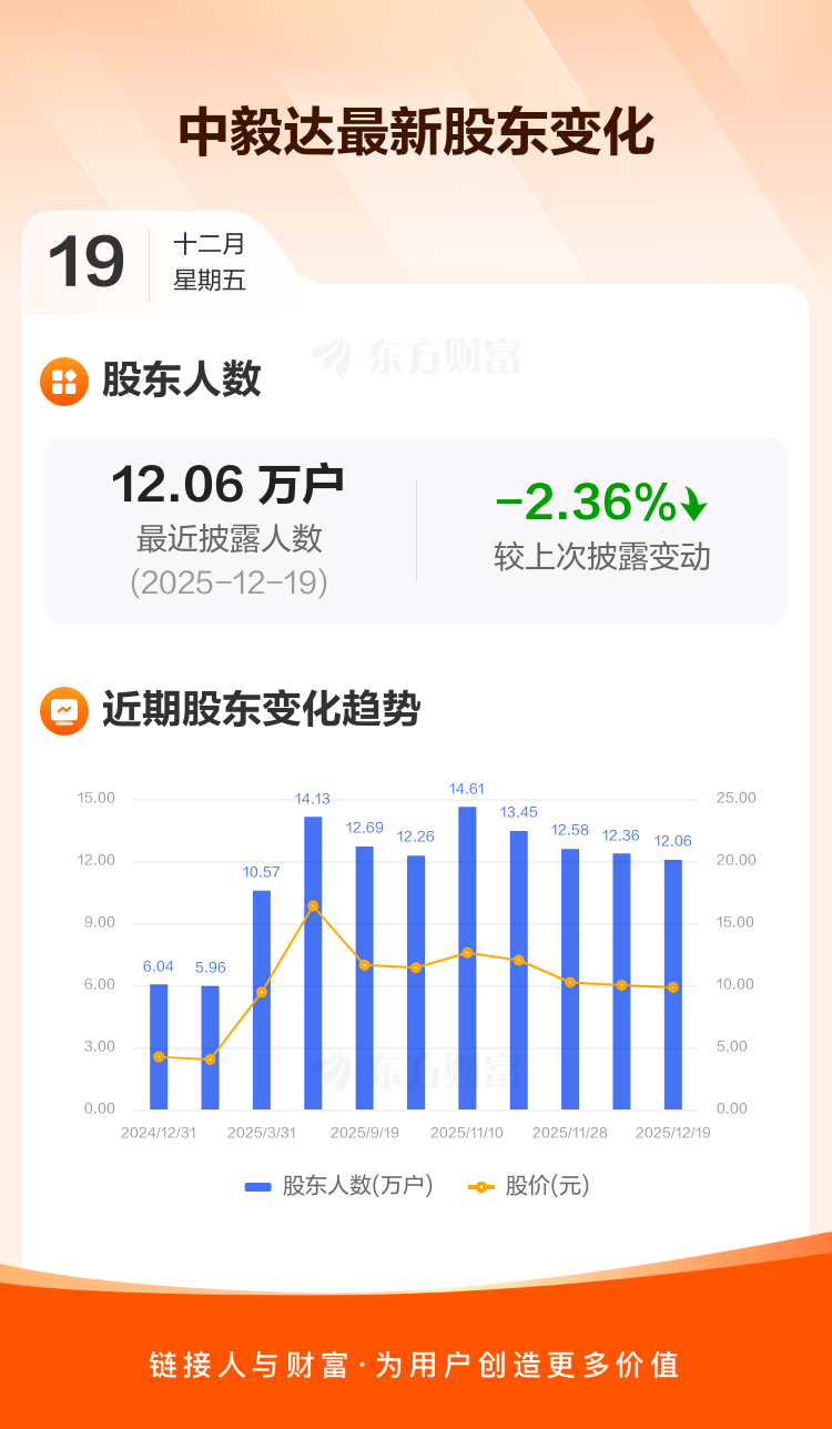 中毅达最新披露数据显示,截至12月19日公司股东户数为12.06万户,较上期(2025年12月10日)减少2917户,降幅为2.36%。户均持有流通股数量由上期的8652股上升至8861股,户均持股金额由上期的8.65万元增加至8.71万元。