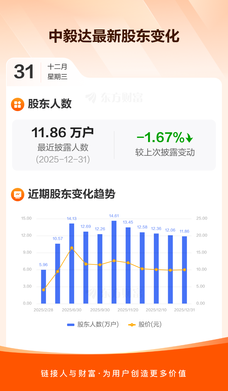 中毅达最新披露数据显示,截至12月31日公司股东户数为11.86万户,较上期(2025年12月19日)减少2010户,降幅为1.67%。户均持有流通股数量由上期的8861股上升至9011股,户均持股金额由上期的8.71万元增加至8.95万元。