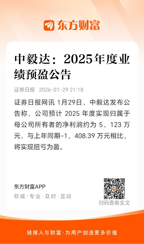 证券日报网讯 1月29日,中毅达发布公告称,公司预计 2025 年度实现归属于母公司所有者的净利润约为 5,123 万元,与上年同期-1,408.39 万元相比,将实现扭亏为盈。