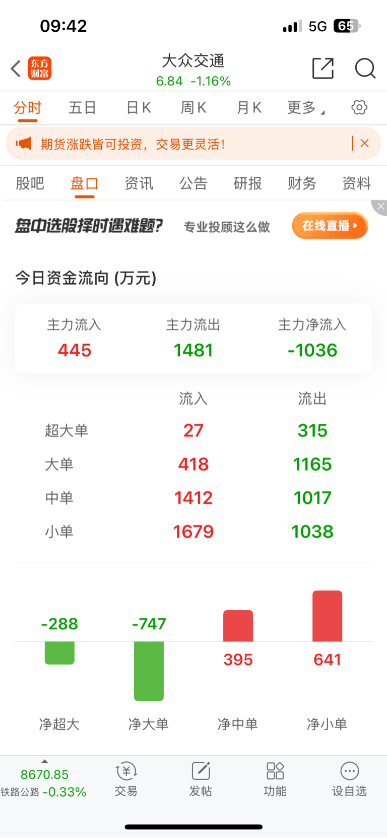 $大众交通(SH600611)$ 主力几乎每天都在流出,还不跑等什么?