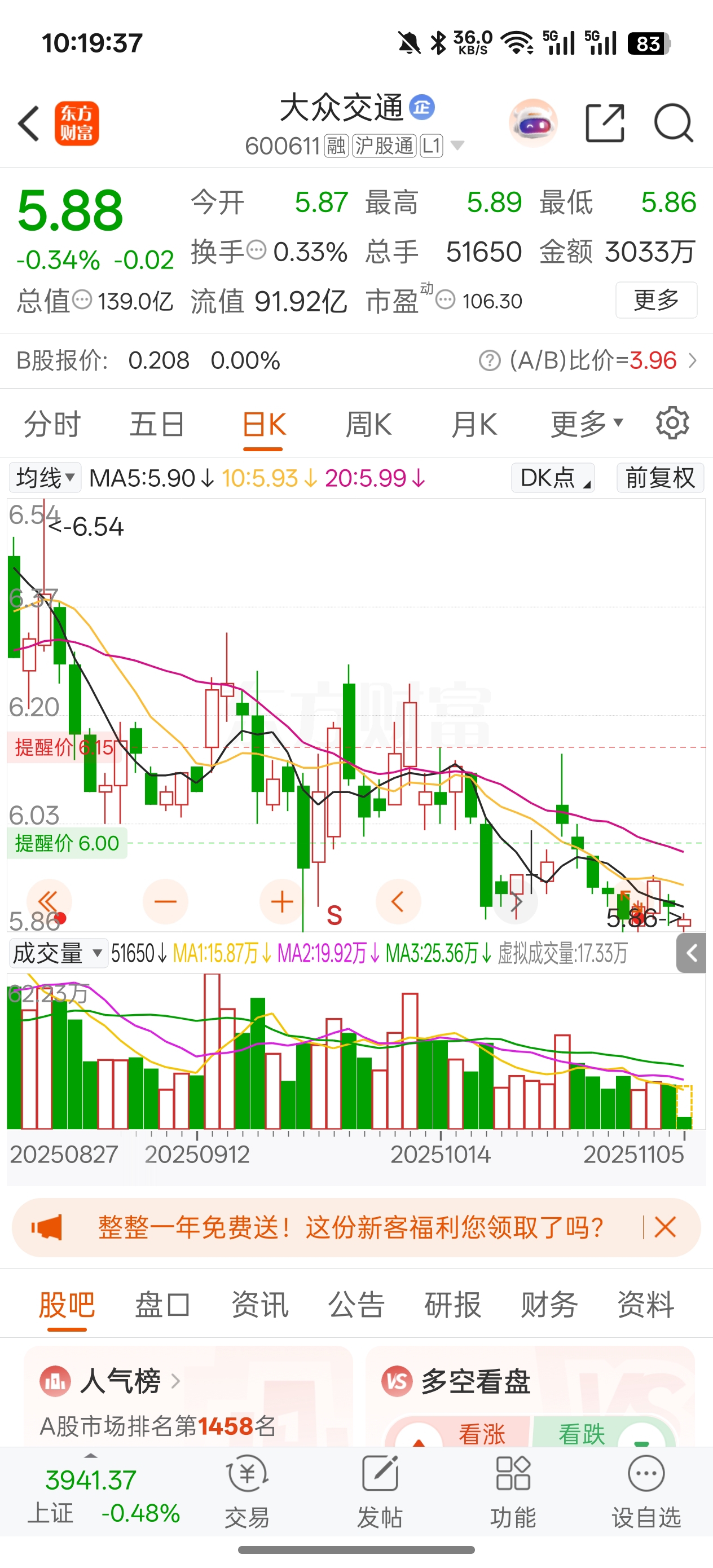 $大众交通(SH600611)$ 缩量了,再不涨,这股票彻底废了,拿了3个月,一直都在6块钱徘徊,涨又涨不了,跌又跌不下,一直横盘