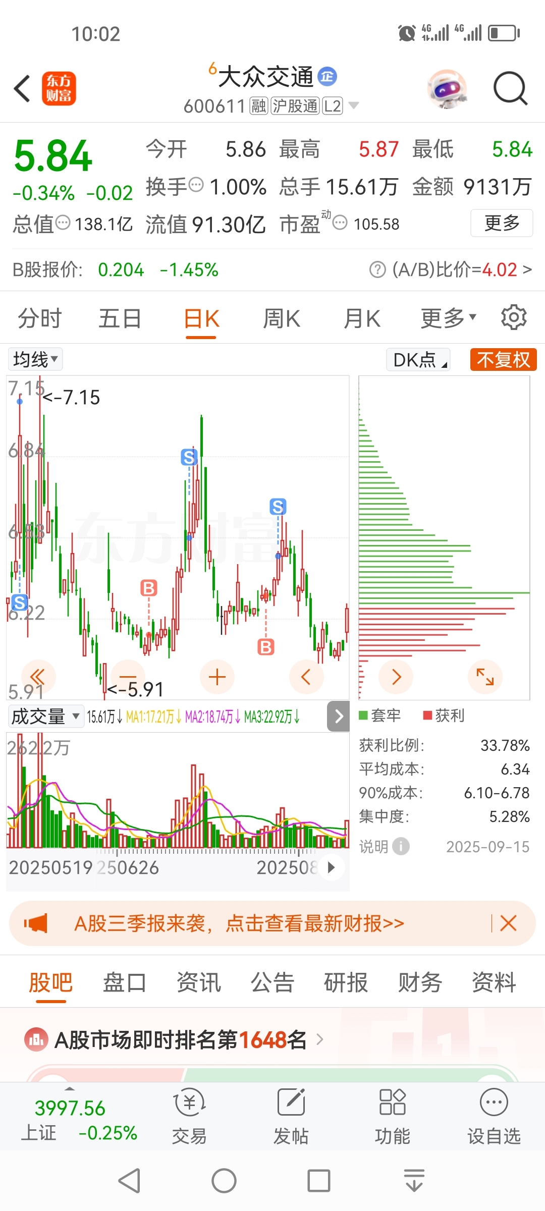 $大众交通(SH600611)$ 星期一进了进了不管了,胆大先吃肉不管了,躲几天先看看情况在说,外面实在太高了。