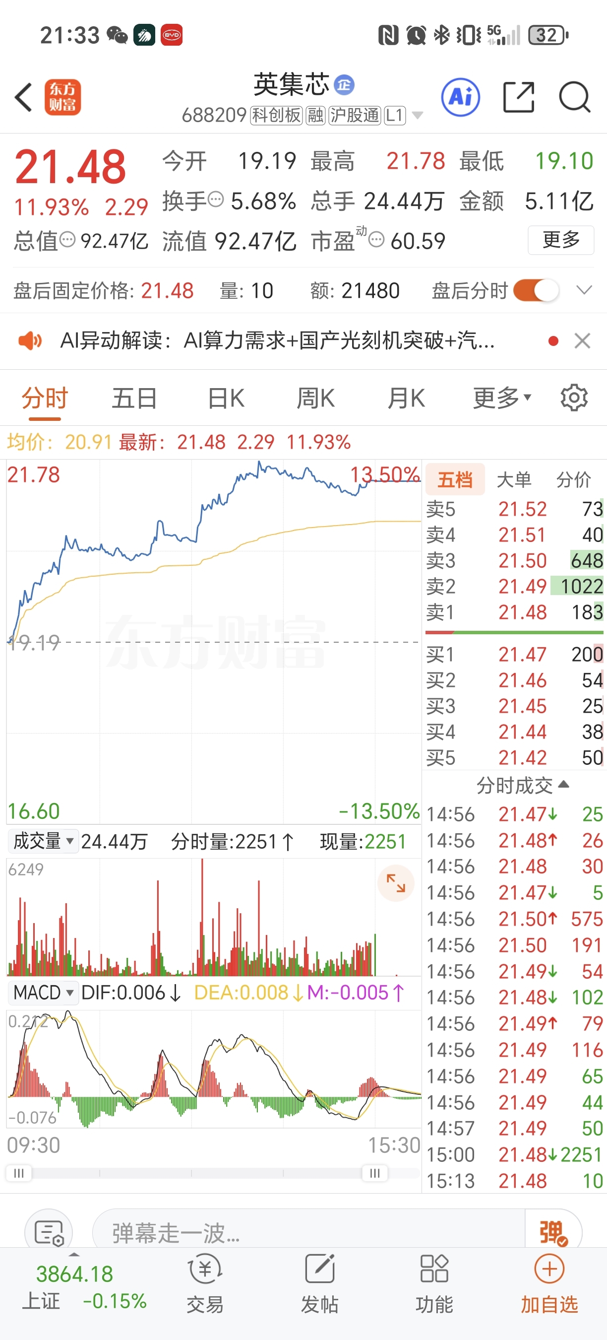 $大众交通(SH600611)$ 英集芯0.2687%,对应市值2484万元。