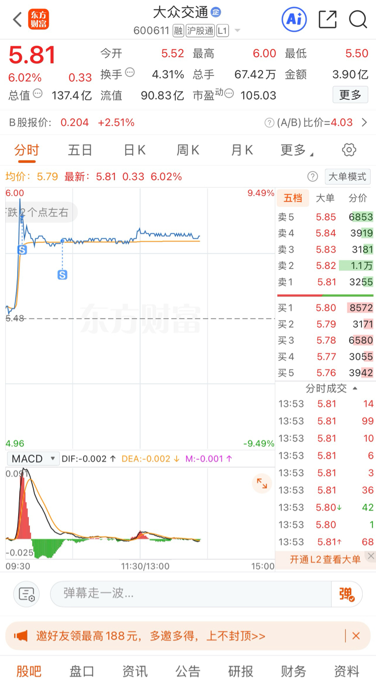 $大众交通(SH600611)$ 冲高就该卖的,唉,犹豫了一下损失了好多利润