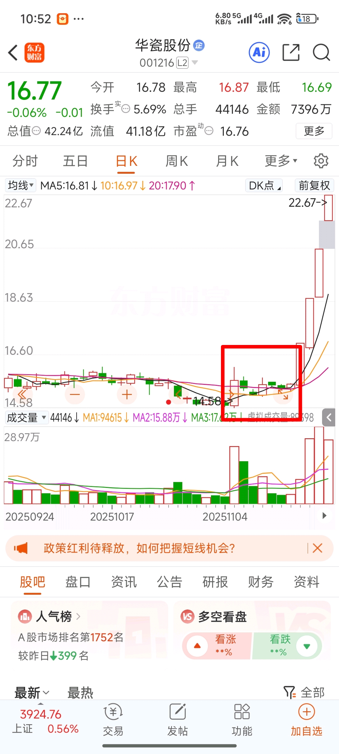 $大众交通(SH600611)$ 参考华瓷,挖坑以后突然一根阳线,不断一拉一砸,k线画的太漂亮了