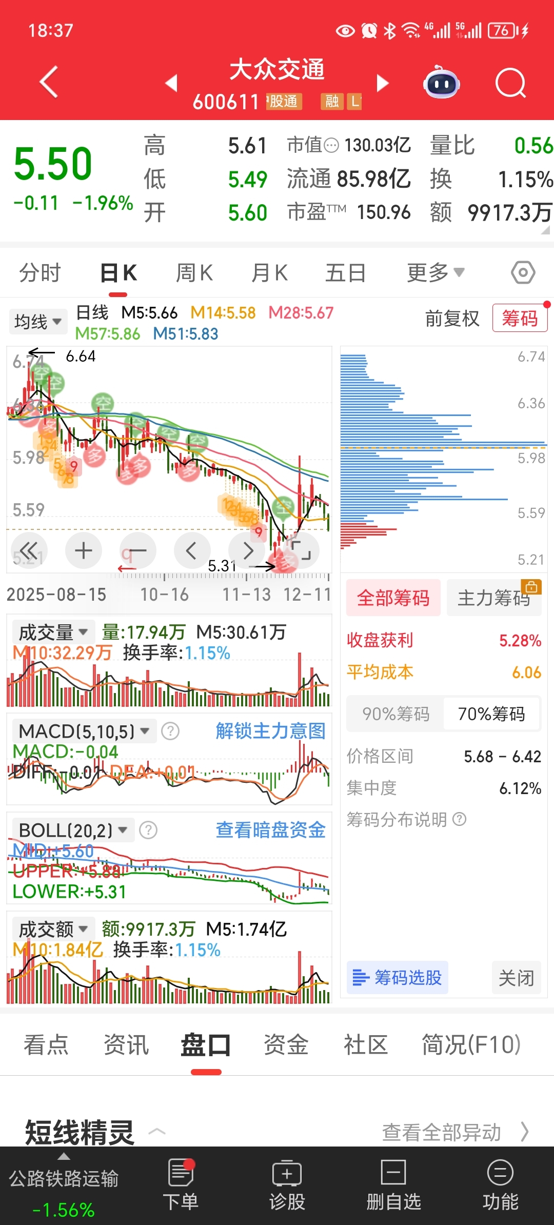 筹码都压在上方,看日K和月K,这么重的套牢盘压在上方,你们还想着大众能走上一波拉