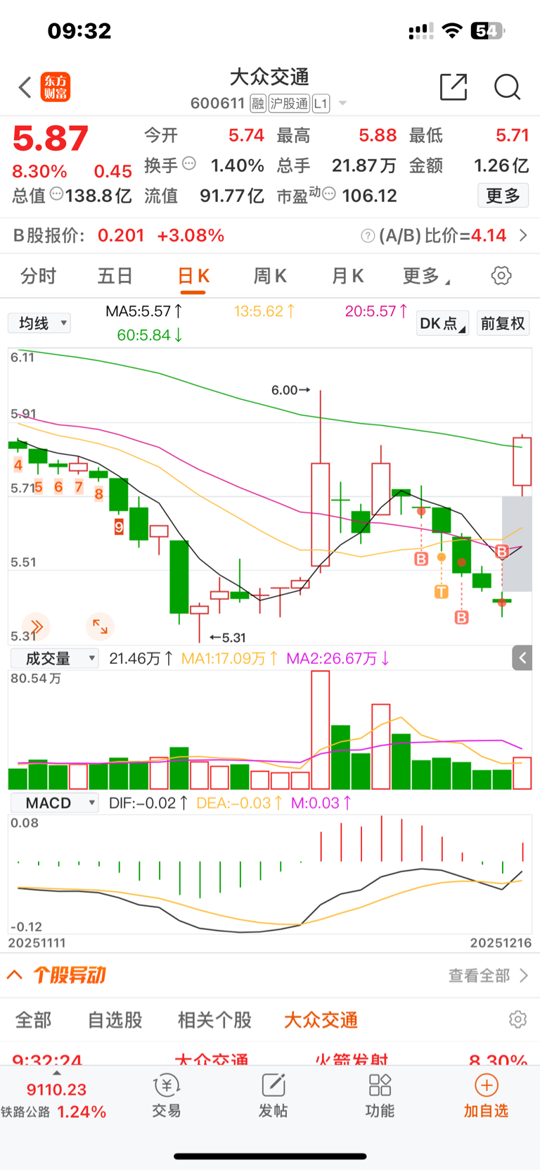 $大众交通(SH600611)$ 这货谁买谁亏,套了一周了终于解套