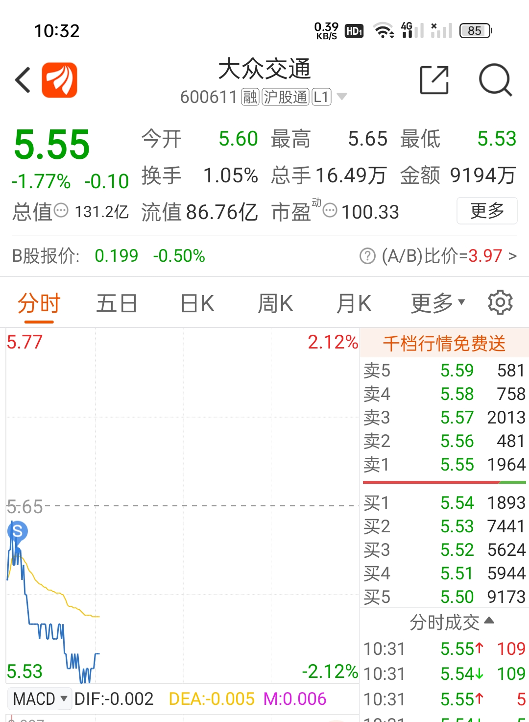 $大众交通(SH600611)$ 估计今天在底部织布一天。