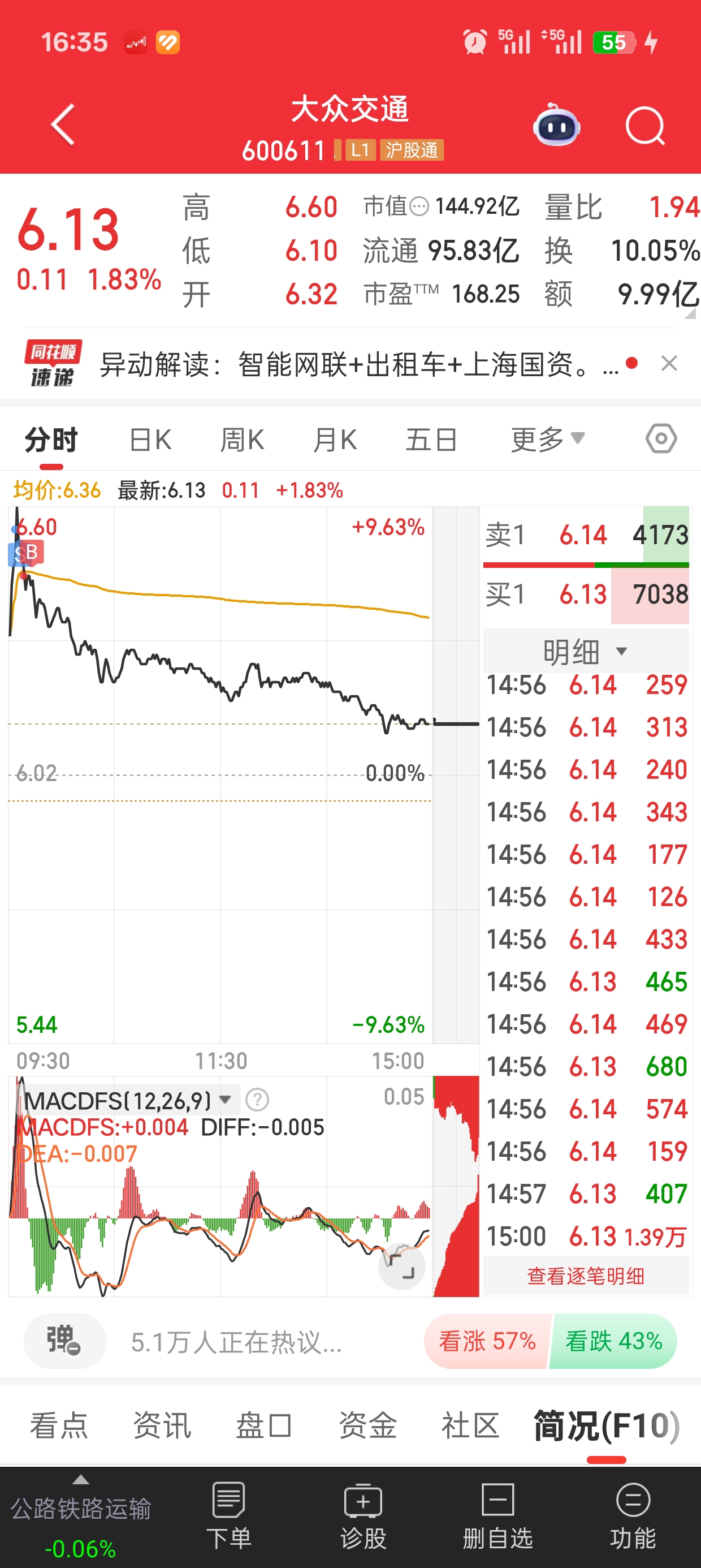 $大众交通(SH600611)$ 今天我没苦硬吃